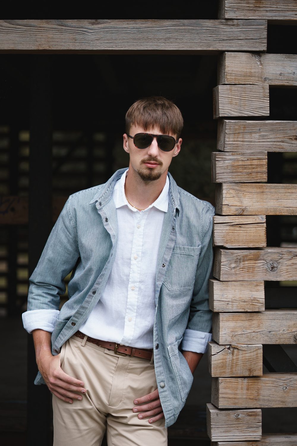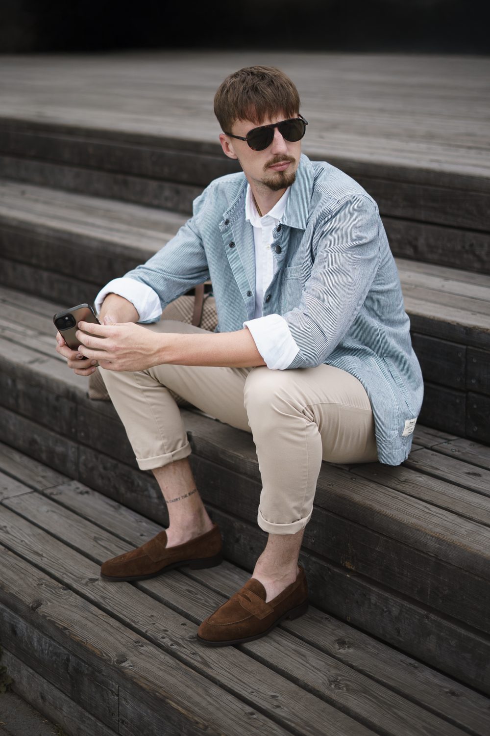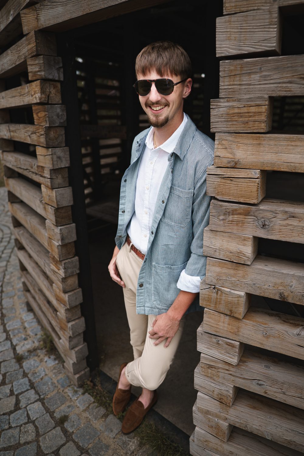 David v rozhovoru několikrát zmínil, že jeho vztah k oblékání se změnil s prvním zaměstnáním. Z kluka, kterému bylo jedno co si vezme, se stal muž, který ví, že dobré oblečení má svůj význam i účel. Rád se obléká hezky a slušně, ale nejdůležitější je pro něj pohodlí a dobrý pocit. Móda pro něj není dogma a nemá třeba problém vyběhnout v ponožkách a sandálech do obchodu. Právě z toho jsme vycházeli při naší malé proměně stylu. Zůstali jsme věrní tomu, co David skutečně nosí, jen jsme jeho šatník jemně osvěžili a přidali trochu (pro Davida typického) nadhledu. V hlavní roli se tentokrát představila značka Barbour a její uvolněný a dokonale padnoucí overshirt, Charles Tyrwhitt se svou lněnou košilí a ikonický Berwick s fešnými mokasínami.