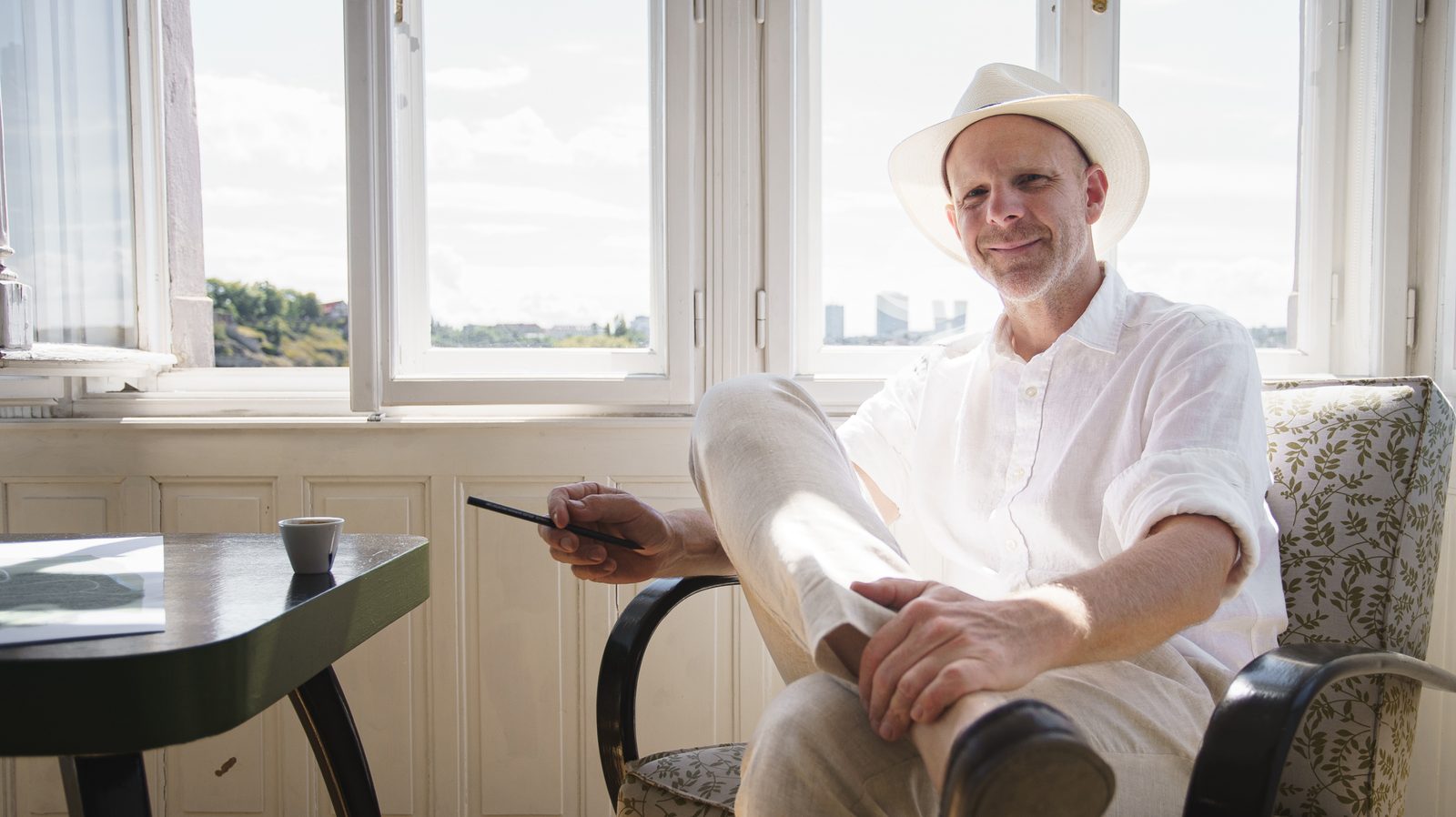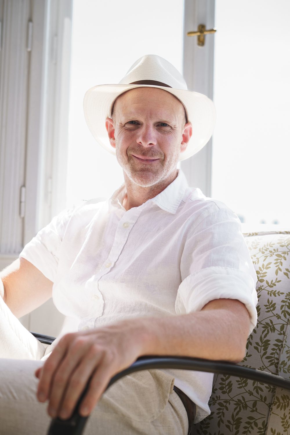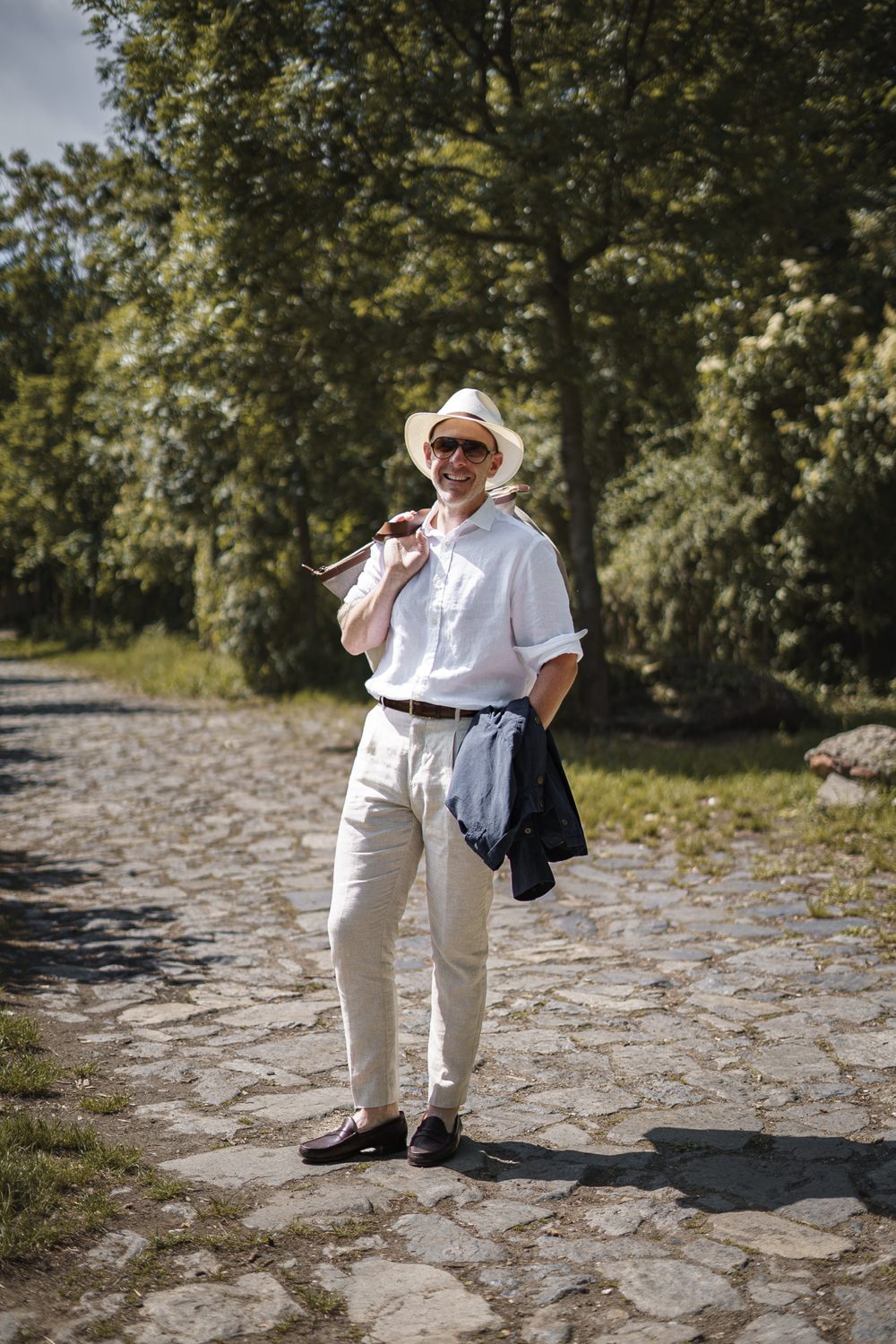 Ferdinand má na sobě lehkou lněnou košili v popelínové vazbě Charles Tyrwhitt Pure Linen Shirt, plisované lněné kalhoty Brooksfield Pleated Linen Trousers a minimalistický klobouk z raffia slámy Stetson Traveller Raffia.