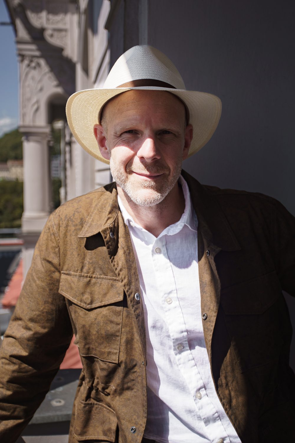 Ferdinand má na sobě lehkou lněnou košili v popelínové vazbě Charles Tyrwhitt Pure Linen Shirt, plisované lněné kalhoty Brooksfield Pleated Linen Trousers, cargo bundu Barbour Corbridge Utility Jacket, kožený pásek Berwick, minimalistický klobouk z raffia slámy Stetson Traveller Raffia.