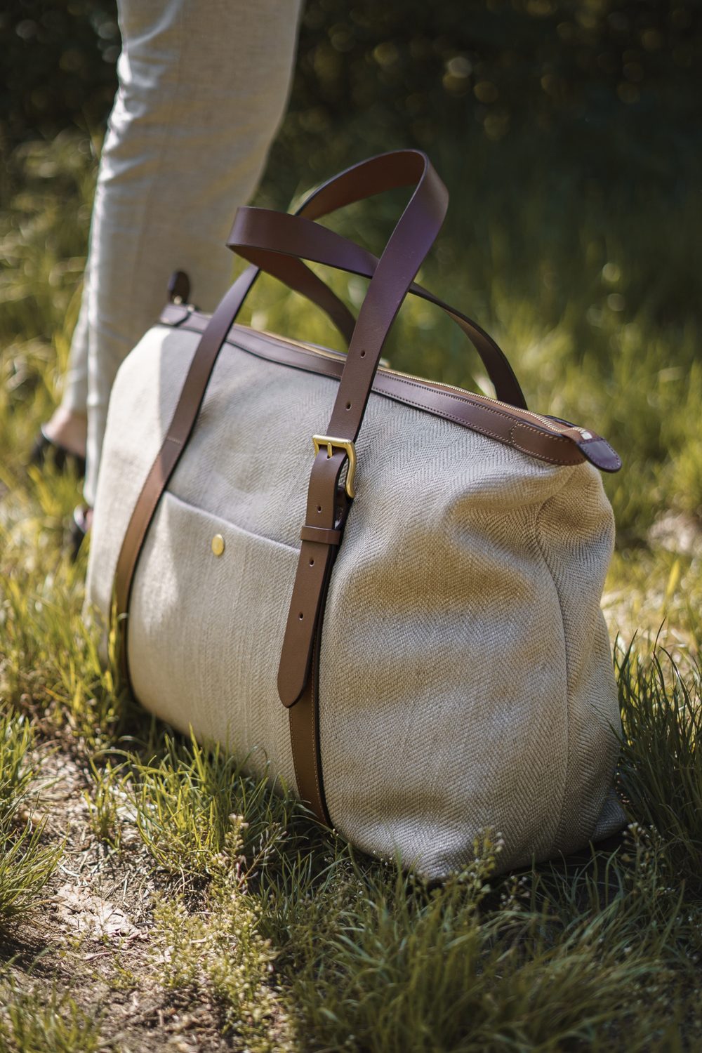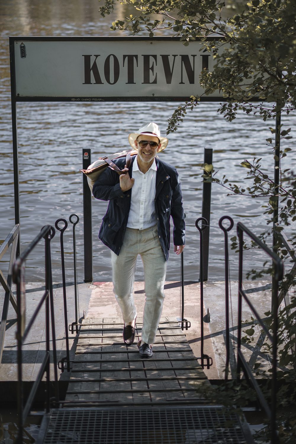 V našem outfitu má Ferdinand na sobě lehkou lněnou košili v popelínové vazbě Charles Tyrwhitt Pure Linen Shirt, plisované lněné kalhoty Brooksfield Pleated Linen Trousers, cargo bundu Barbour Corbridge Utility Jacket, kožený pásek Berwick, minimalistický klobouk z raffia slámy Stetson Traveller Raffia a prostornou tašku od dánské značky Mismo.