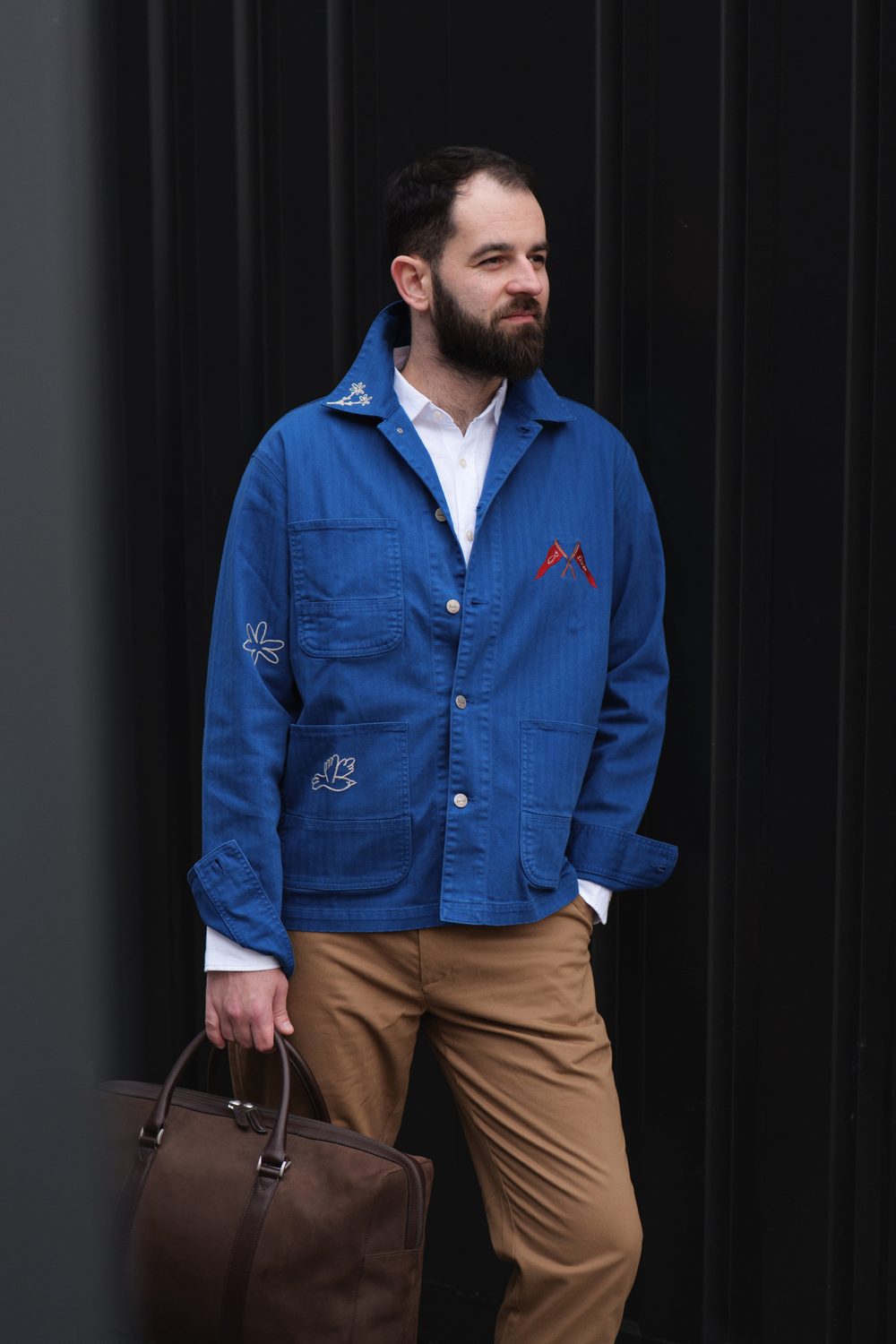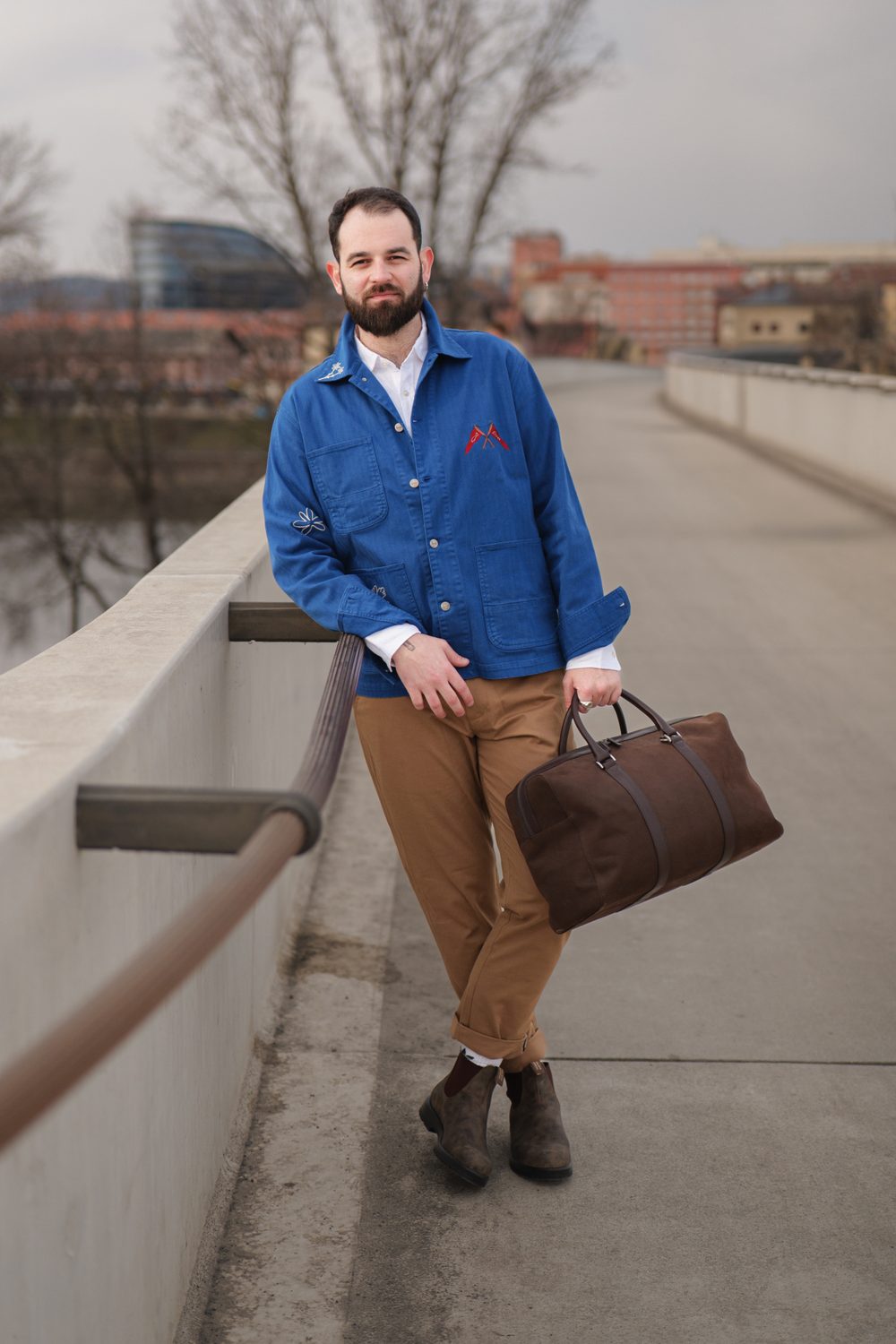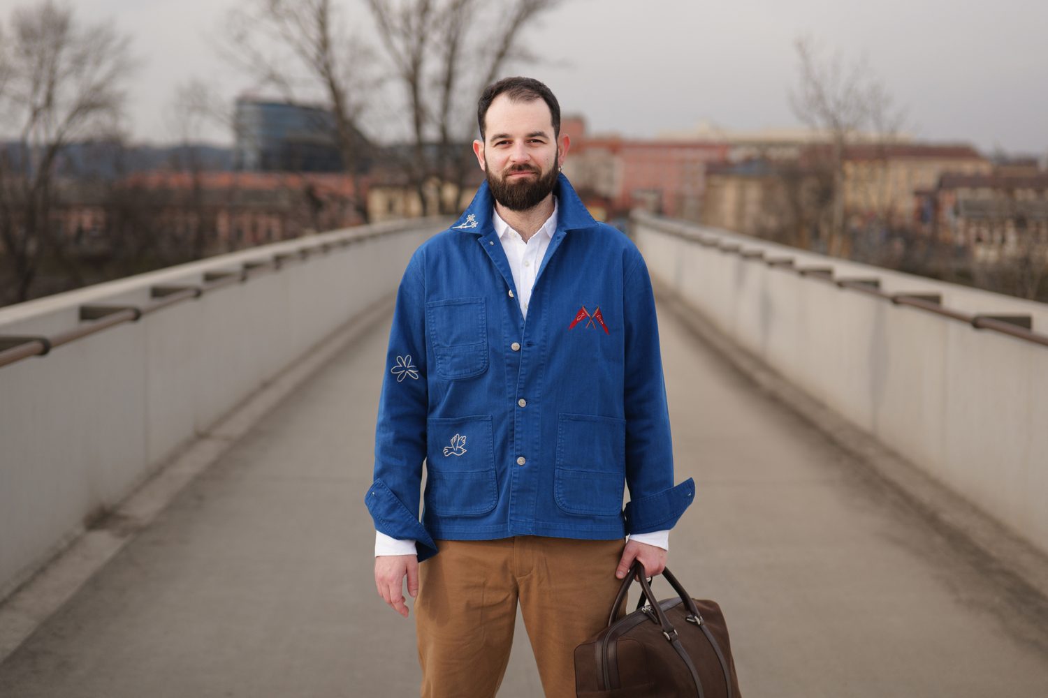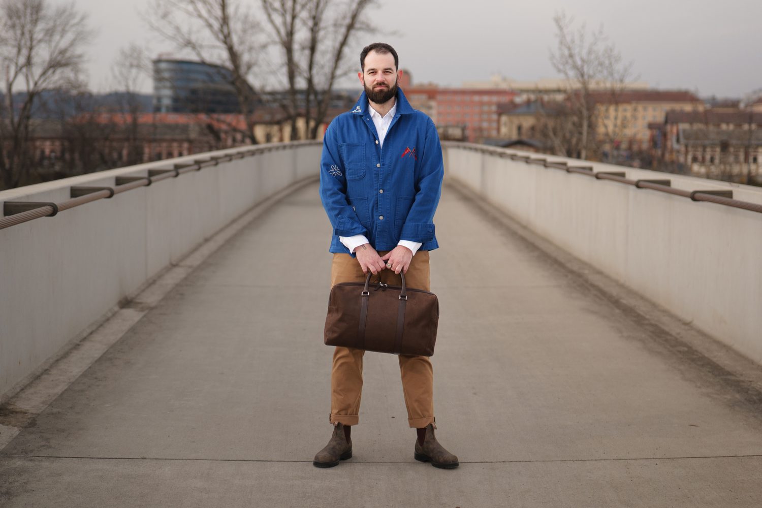 Filip k nám do podcastu přišel ve svém běžném oblečení, které jasně ukazovalo, co je pro něj v módě nejdůležitější – pohodlí. Při naší jemné proměně stylu jsme proto zůstali u stejného základu, jen jsme sáhli po výraznějších a promyšlenějších kouscích. Hlavní roli sehrál sytě modrý overshirt od naší oblíbené dánské značky forét, který definoval celou siluetu a dodal jí strukturu. Doplnili jsme ho čistou, lehkou lněnou košilí od Charles Tyrwhitt a minimalistickými pískovými chinos od Barbour. Outfit jsme zakončili koženými kotníkovými botami od tasmánské značky Blundstone. A kdyby náhodou bylo potřeba na chvíli zmizet a vyčistit si hlavu, přidali jsme ještě víkendovou tašku od Carl Friedrik.