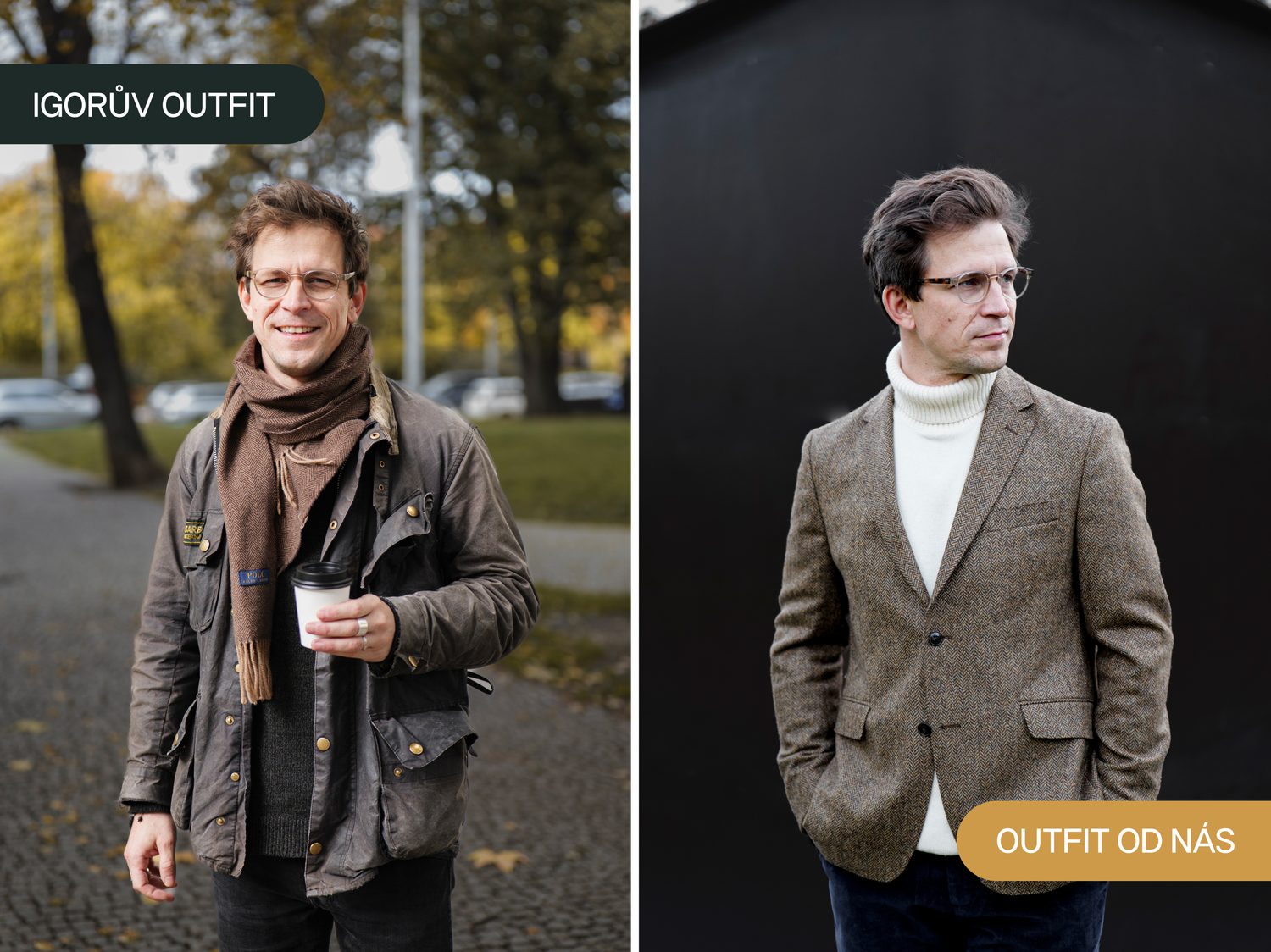 Igor přišel do našeho podcastu jako klasik a stylař, který do puntíku naplnil to, co o svém vztahu k módě posléze řekl. Džíny, hodně nošená, ale pořád pěkná Barbour bunda, a triko s pudlem. Igor v našem rozhovoru říkal, že má rád věci, které jsou hlavně kvalitní, a tak jsme se toho (jako vždy) absolutně drželi. Hlavní roli tentokrát hrál Barbour (konkrétně sako, svetr a boty), který Igor nosí a je jemu srdci blízký, a pak další skvělá britská značka Charles Tyrwhitt (chinos).