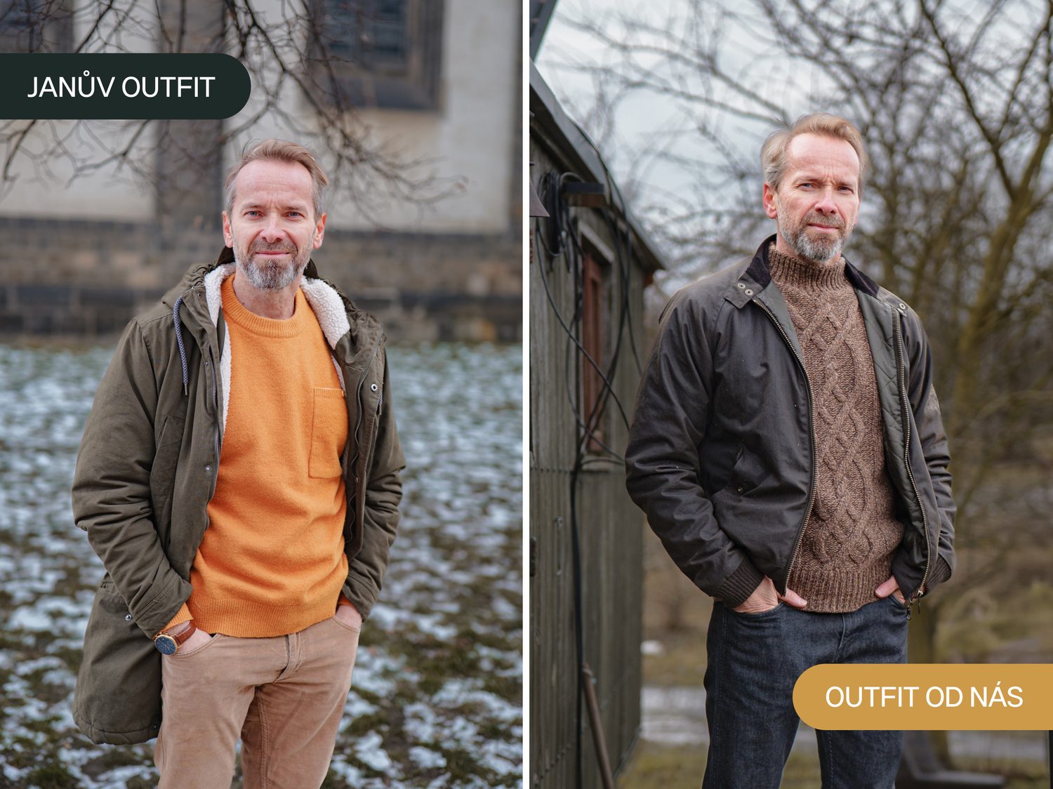 Mikinu jsme pak vyměnili za jemný vlněný svetr od italské značky Brooksfield a manšestráky za Honzovy vlastní džíny.