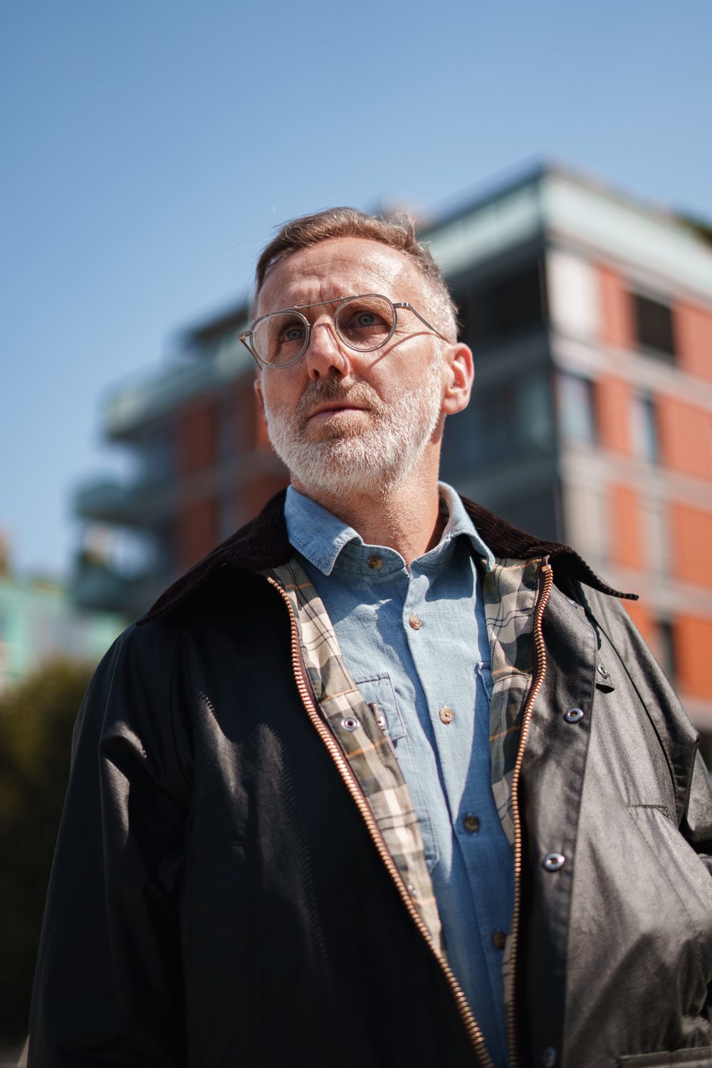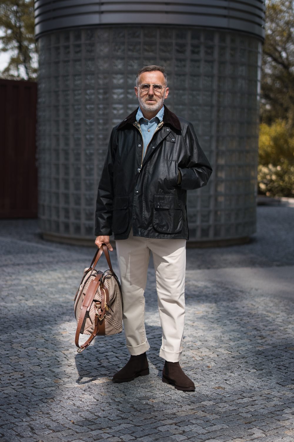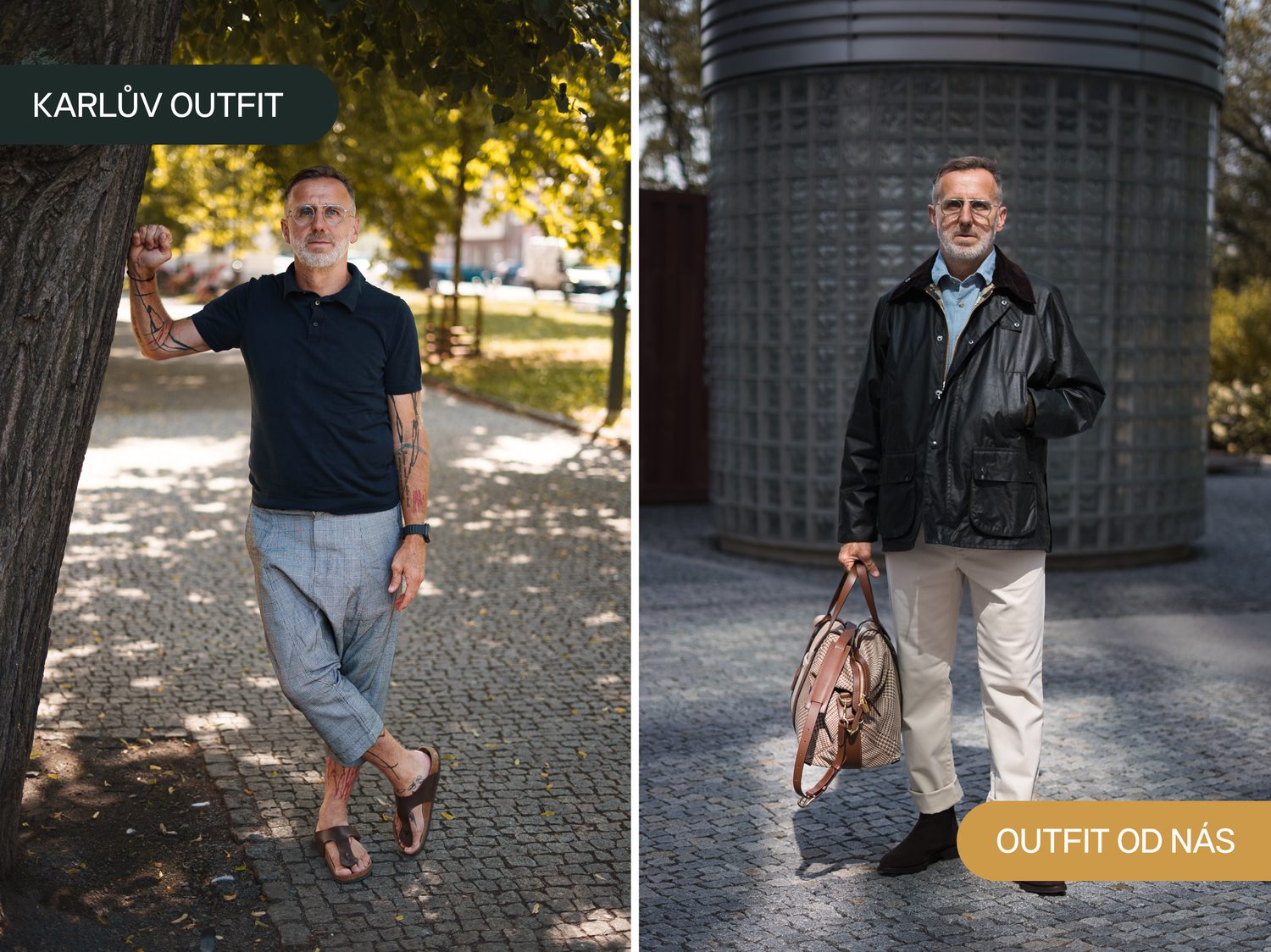 Když Karel dorazil do našeho podcastu, hned na úvod prohlásil, že outfit pro malou proměnu stylu si vybere sám. O jeho vkusu jsme nepochybovali a byli jsme zvědaví, kam nás dovede. Ve spolupráci s naším stylistou nakonec sáhl po britské klasice: legendární voskované bundě Barbour Bedale Wax Jacket, denimovém overshirtu a pohodlných chinoskách od Charlese Tyrwhitta. Celek doplnily kotníkové boty Berwick a ikonická dánská taška Mismo Avail.