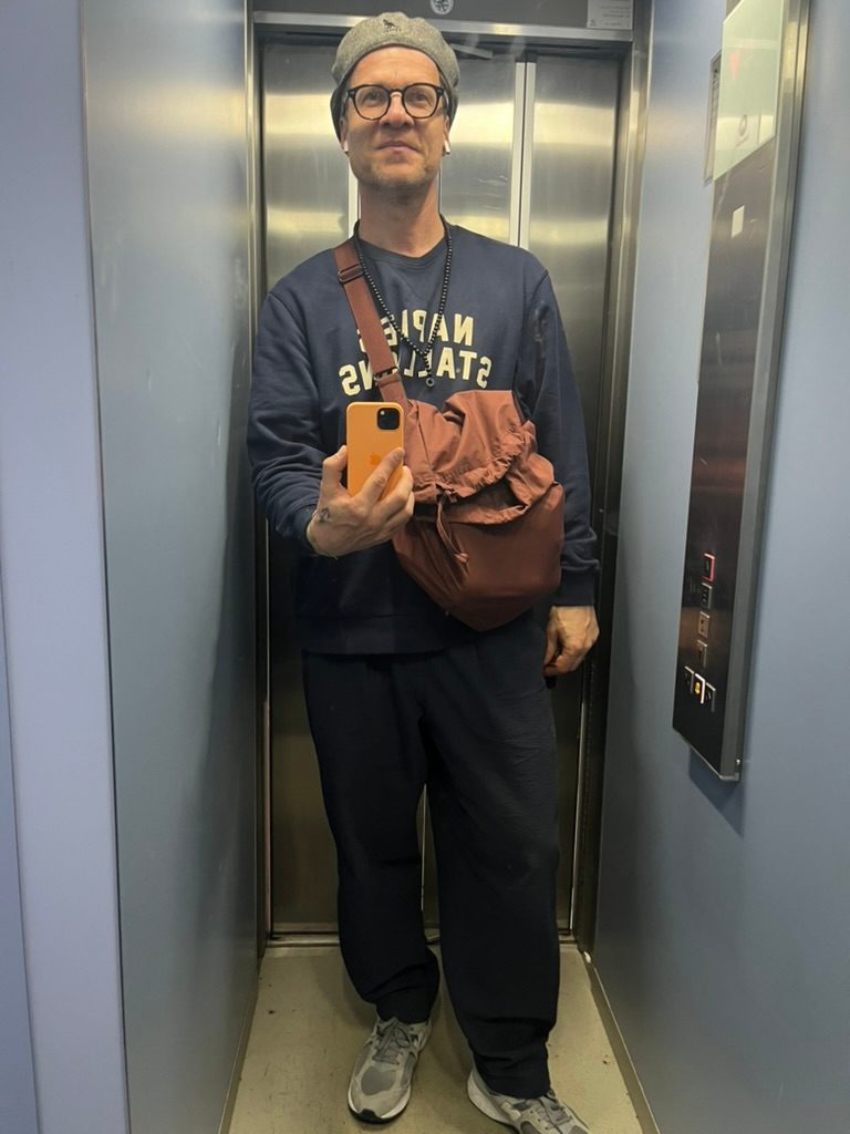 Taška, ideálně shopping bag (ve stylu klasického Boat and Tote od L.L.Bean), nebo různé variace plátěných tote bagů. Teď nejraději nosím jednoduchou denim tašku od A.P.C. Mám i pár batohů a v poslední době, co mě začaly ukrutně bolet bedra, tak nad nimi opatrně začínám přemýšlet. Mám jeden takový oblíbený v divné batice od Engineered Garments a jeden old school „plážový” od Jean-Paul Gaultier, asi je zas vytáhnu.