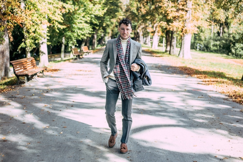 Zelená není příliš častá barva pánského oblečení (kromě armády), kombinace s béžovou ještě méně častá. Tady se to ale podařilo díky tomu, že jde o poměrně světlé odstíny. K šále barevně ladí i knoflíky saka a světlý odstín bot.