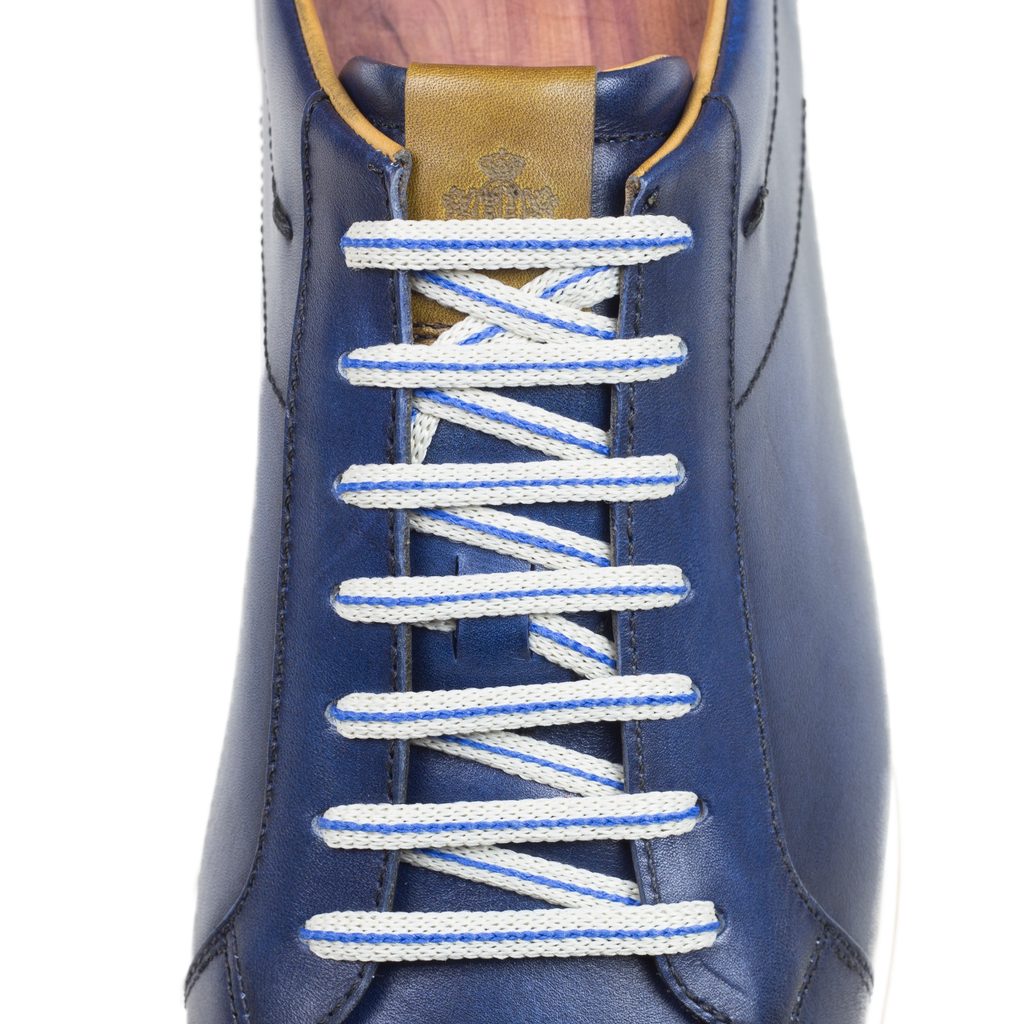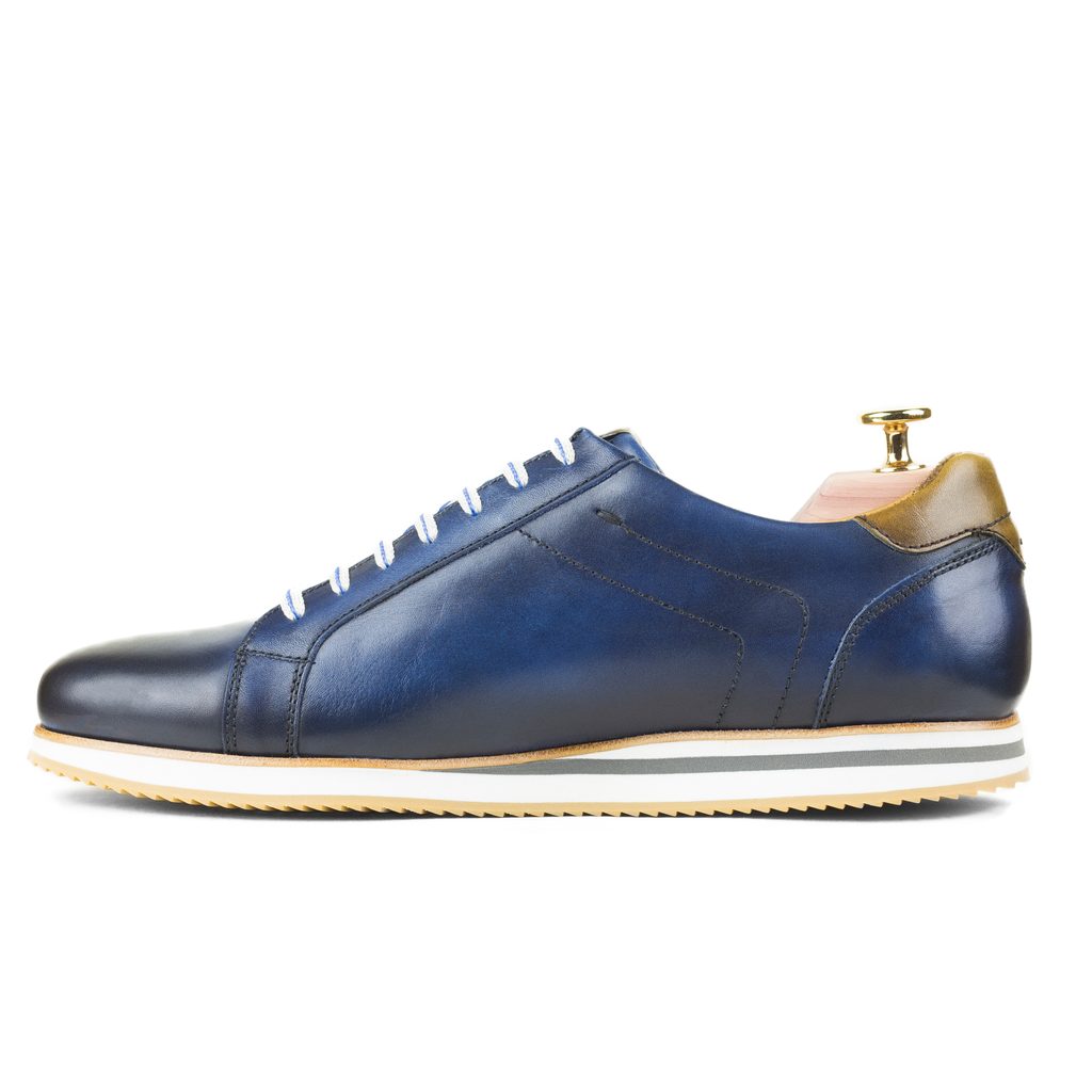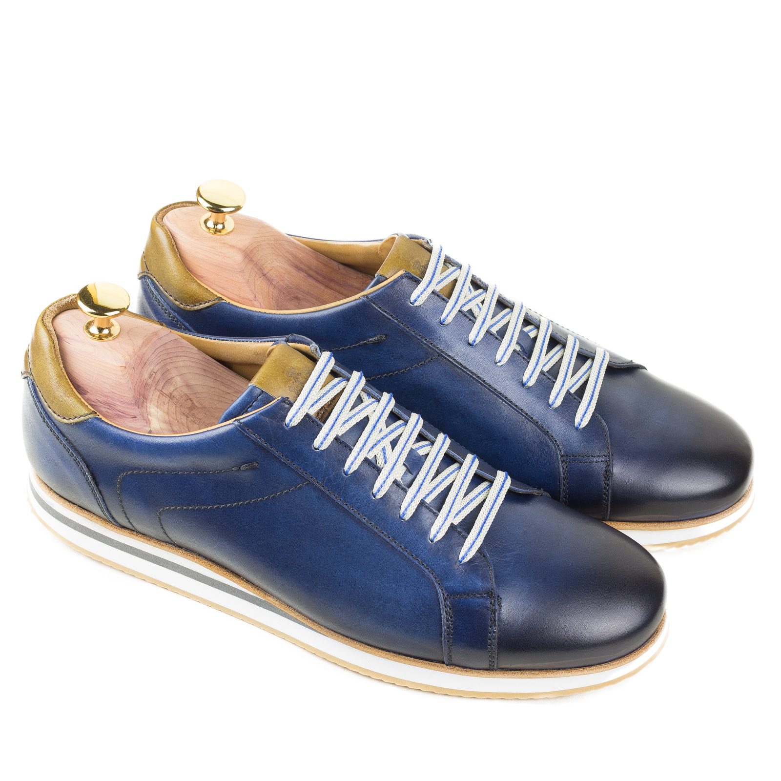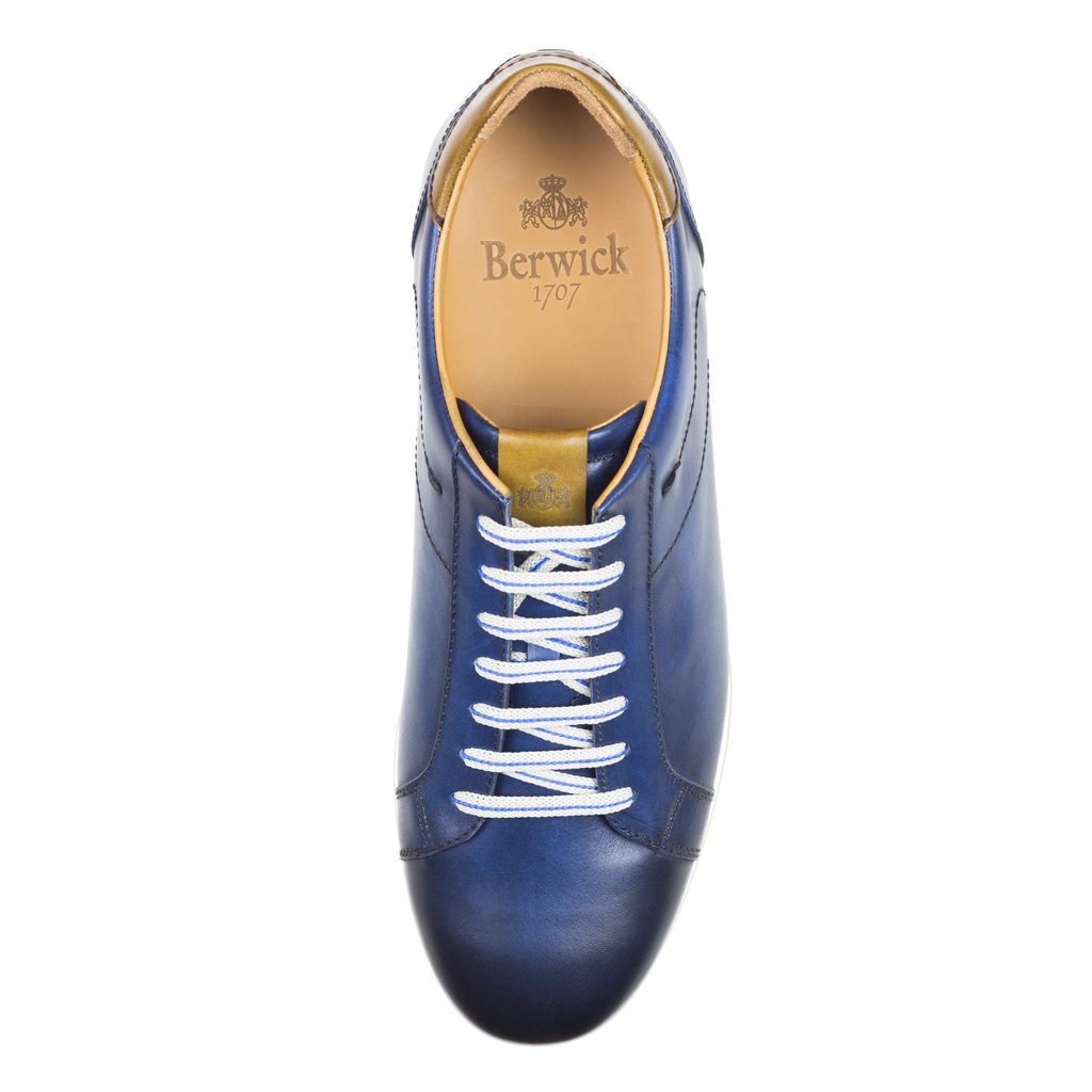 Pohodlné kožené tenisky modré barvy z tříselně činěné hovězí kůže z francouzských koželužen, k tomu odolná podrážka. Ve Španělsku vyrábí firma Berwick.