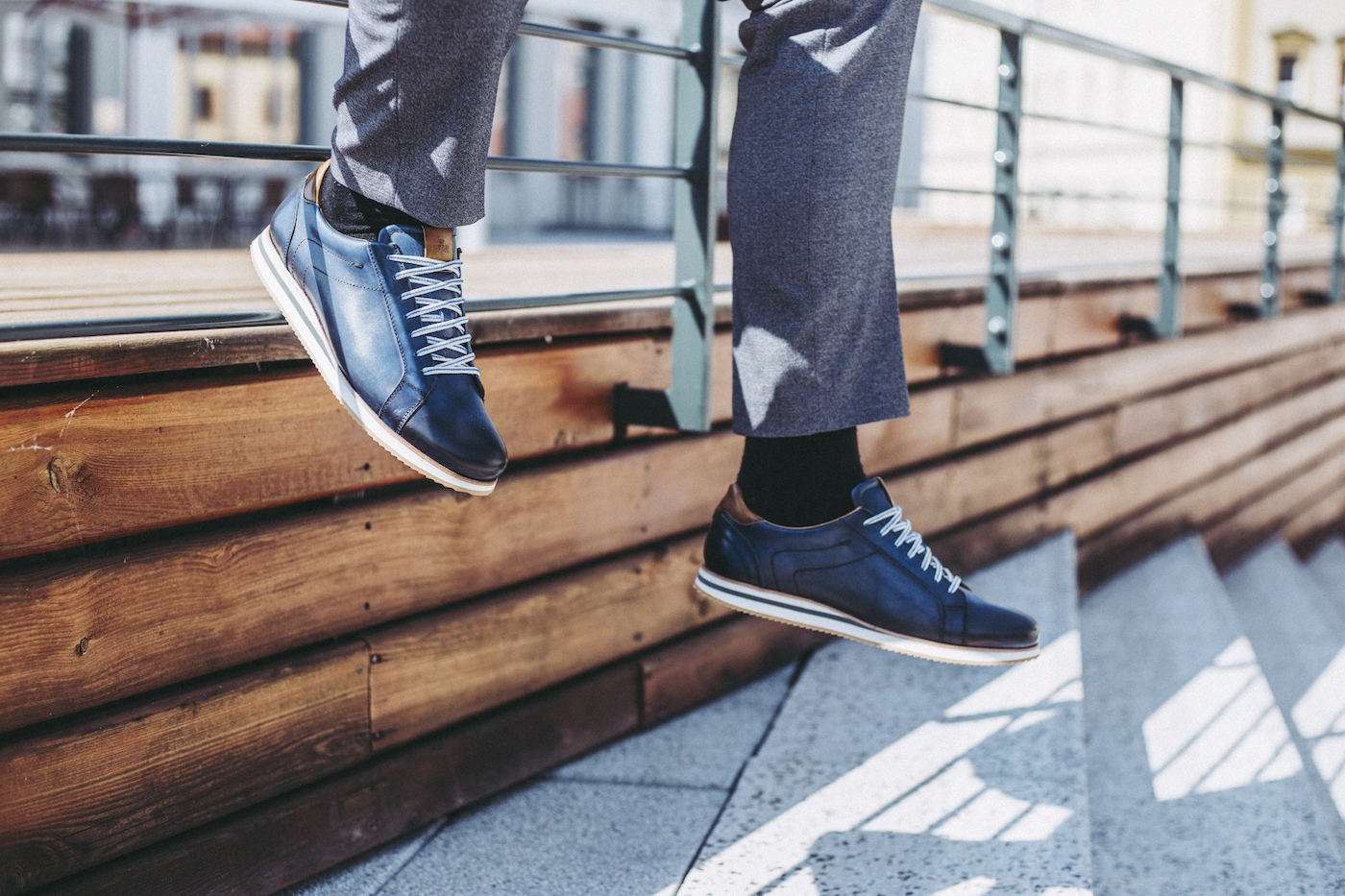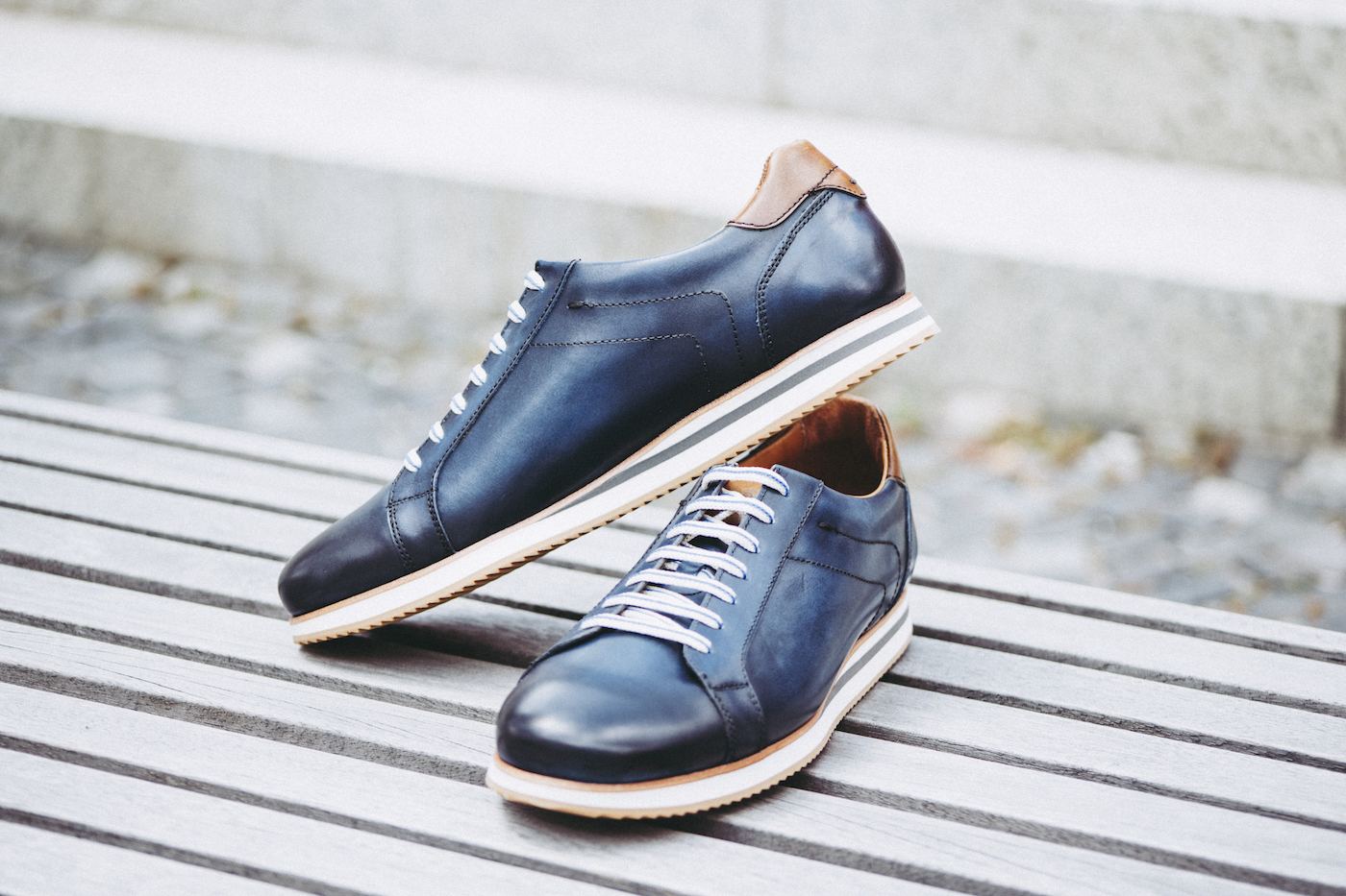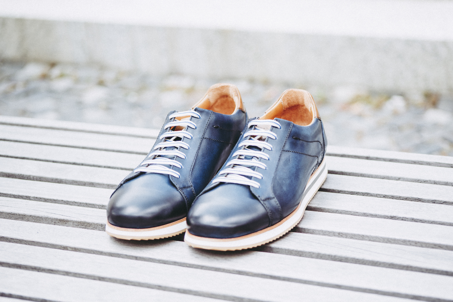 Pohodlné kožené tenisky modré barvy z tříselně činěné hovězí kůže z francouzských koželužen, k tomu odolná podrážka. Ve Španělsku vyrábí firma Berwick.