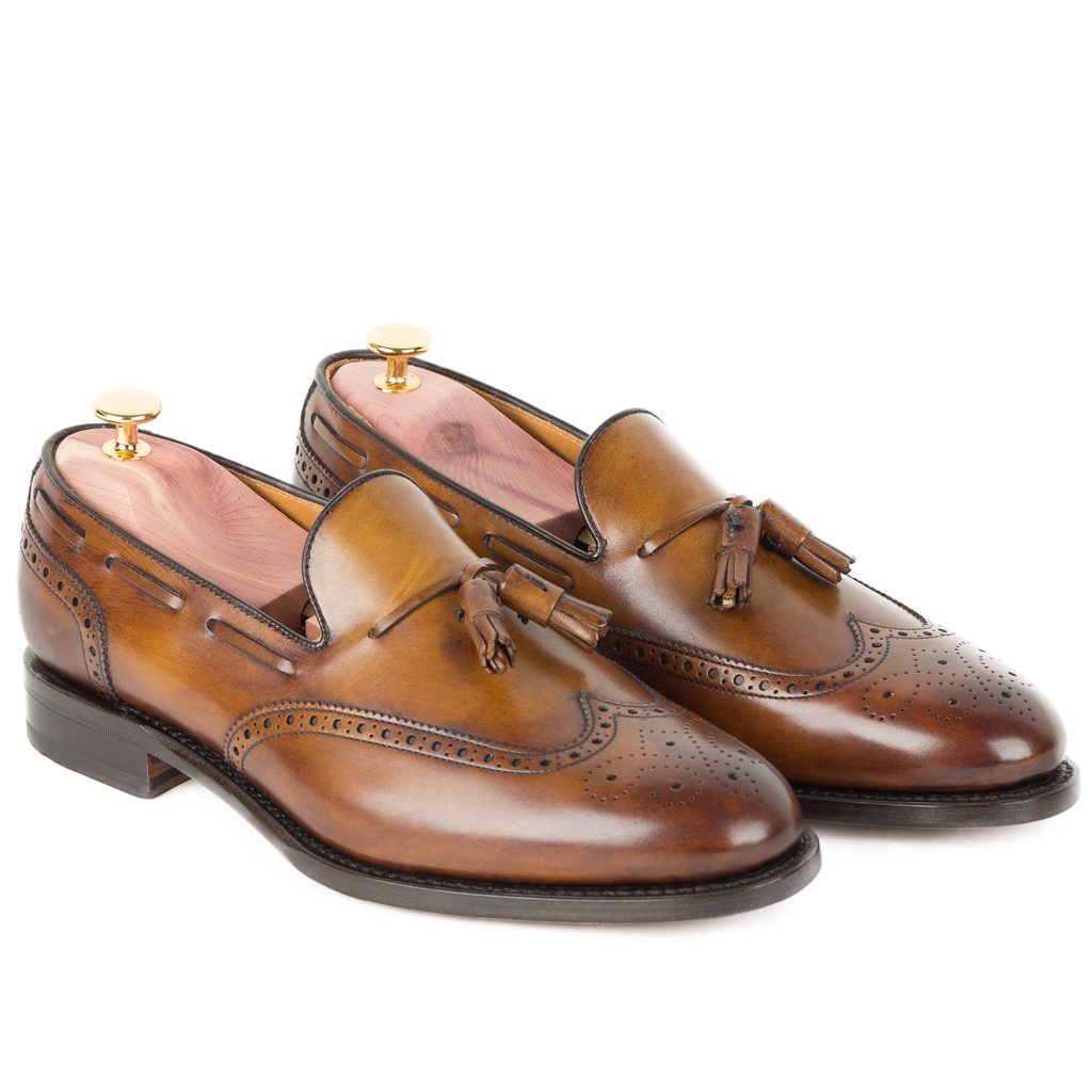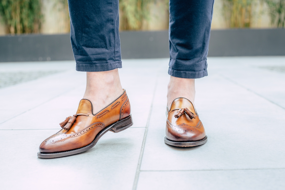 Tassel loafers - mokasíny s charakteristickým ozdobným střapcem na nártu - jsou snad úplně nejneformálnějším typem formálních bot. K tomu přispívá i ozbdobné děrování na nártu, na špičce a v patní části. Jejich přirozený půvab skvěle vynikne například v kombinaci s blazerem a chinos.