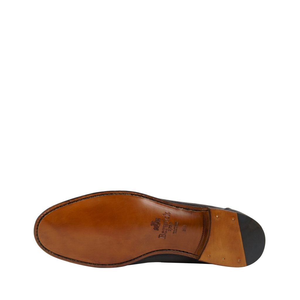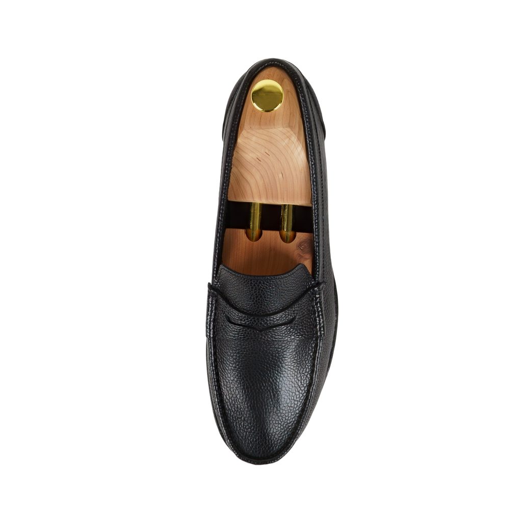 Texturované mokasíny v decentní černé. U penny loafers samozřejmě nemůže chybět charakteristický přední pruh kůže, za nímž ve třicátých letech američtí mladíci nosívali zastrčenou právě jednu penny na hovor z telefonní budky.