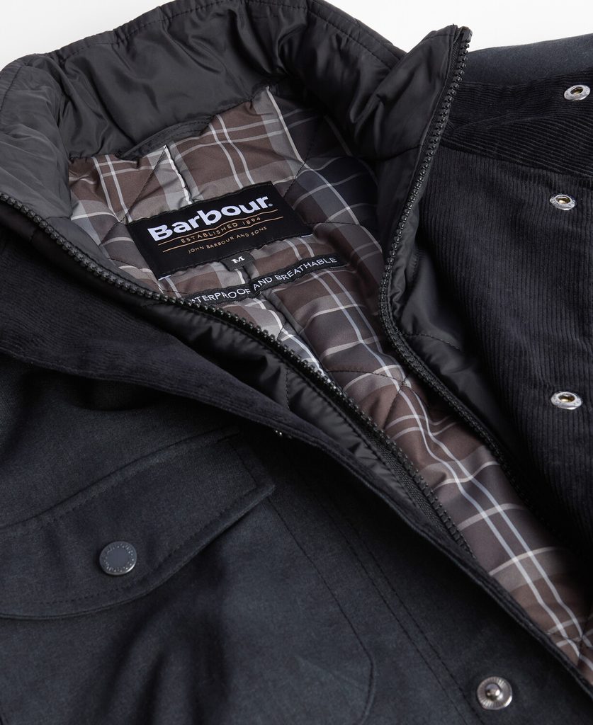 Klasický voskovaný Ogston je stálou částí Barbour už pěknou řádku let. Z módy dosud nevyšel a nutno říci, že asi nějakou dobu ještě nevyjde. V téhle edici – pořádně zimní edici – je místo voskované bavlny vyroben ze směsi polyesteru a polyamidu, která poskytuje nejen teplo, ale je také voděodolná. O teplo se pak postará napevno přišitá vesta se zapínáním na zip (bunda se zapíná také na patentky, kde ale jde naopak o „vnější” část bundy). Potěší také spodní dvojice kapes o dvou vrstvách – jedna přístupná shora s klopou, druhá z boku otevřená – na ruce.