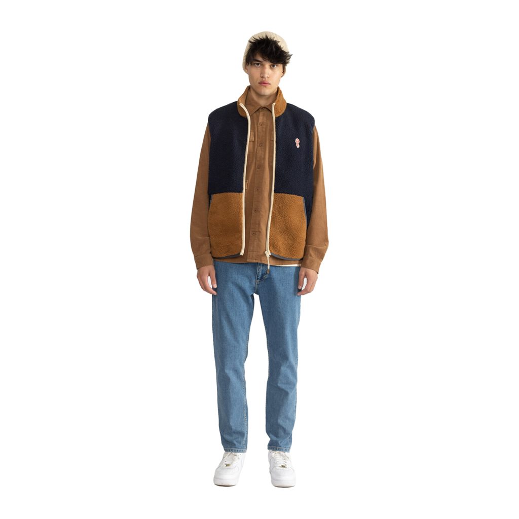 Když zima udeří, je potřeba teplé oblečení. A fleecový polyester určitě teplý je. Ten od Revolution je navíc – jako vždycky – zodpovědně zrecyklovaný, protože na přírodě Skandinávcům záleží. Tahle vesta se pyšní rovnou dvěma barvami: tělo je celočerné s malým odznáčkem značky, břicho a límec jsou naopak vyvedeny v koňakově hnědé. Nezapomínejme ale na detaily – lemování zipu krémově rozřezává celou vestu.