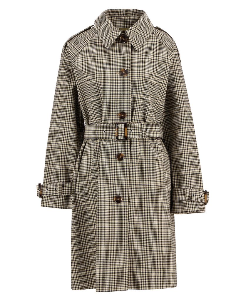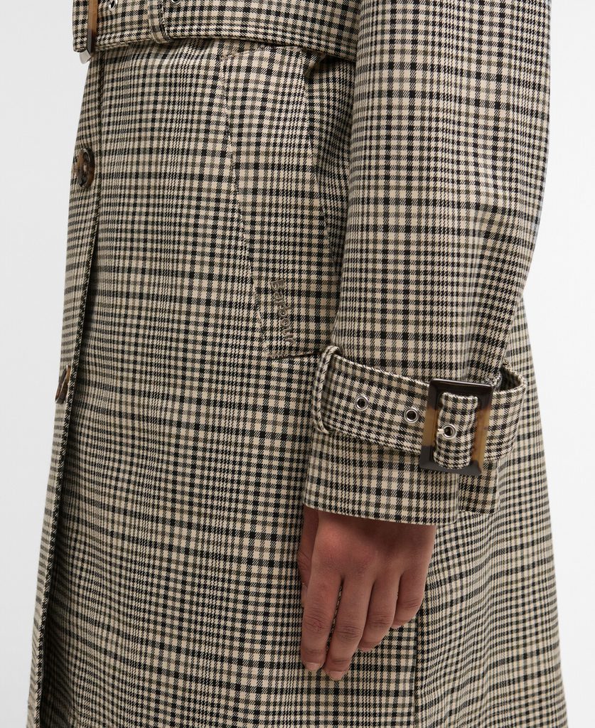 Dámský trenčkot s nepromokavou úpravou v celoplošném drobném kostkovaném vzoru. Má modernější jednořadé zapínání na velké želvovinové knoflíky, pásek v pase je však výsostně klasický a umožňuje dámě nosit kabát v různých stylech. Z dekorací jmenujme epolety na ramenou a funkční utažení manžet na pásek. Nechybí ani dvojice vsazených kapes po stranách.