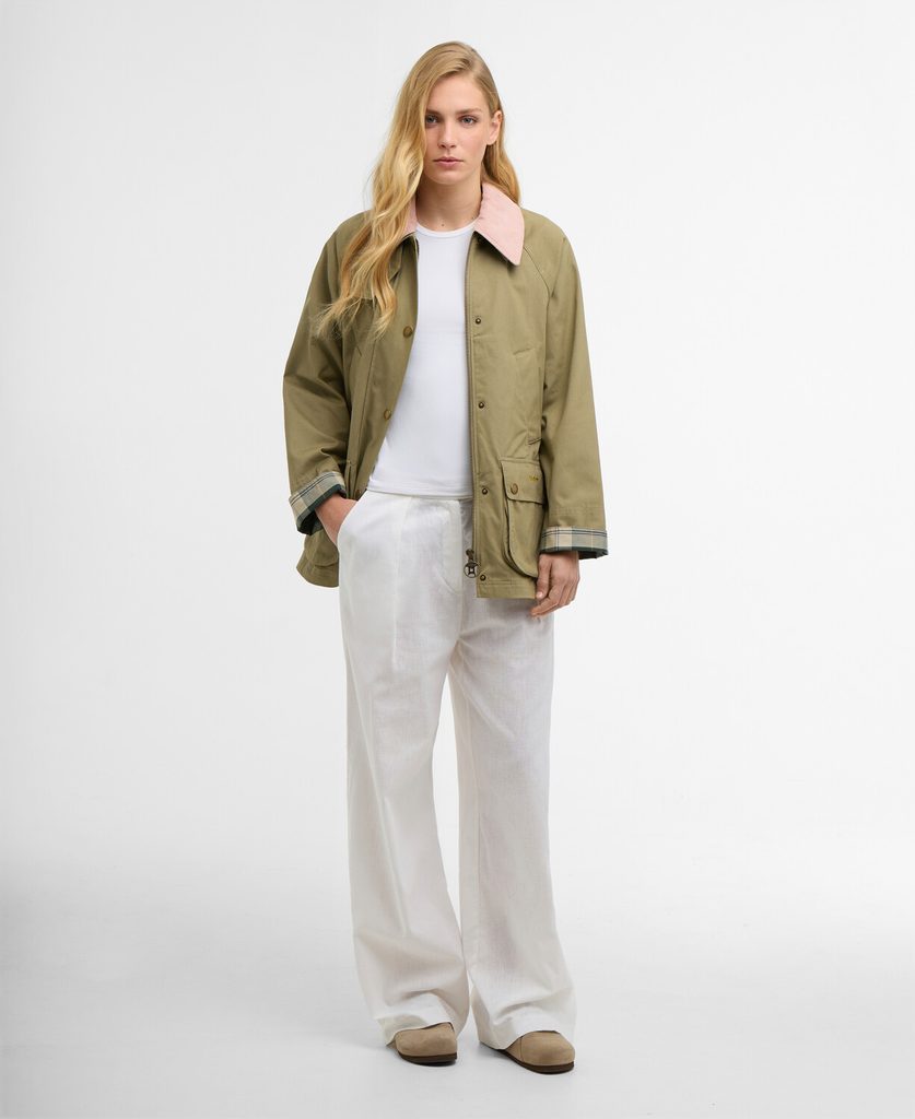 Moderní Beadnell pro moderní dámu. Známý model bundy Barbour je zde poupraven: v běžné délce je vyrobena z lehké bavlny bez voskování, je nepodšitá, tudíž vzdušná a hodí se na jaro a přechodové měsíce. Vršku bundy dominuje výrazný růžový manšestrový límec, který je navíc odnímatelný. Vpředu Vás čekají kapsy na ruce a dvě spodní nakládané kapsy s klopou na patentky. Při ohrnutí rukávů se navíc ukáže tartanový detail na manžetách. Je to skvost, jak vidíte.