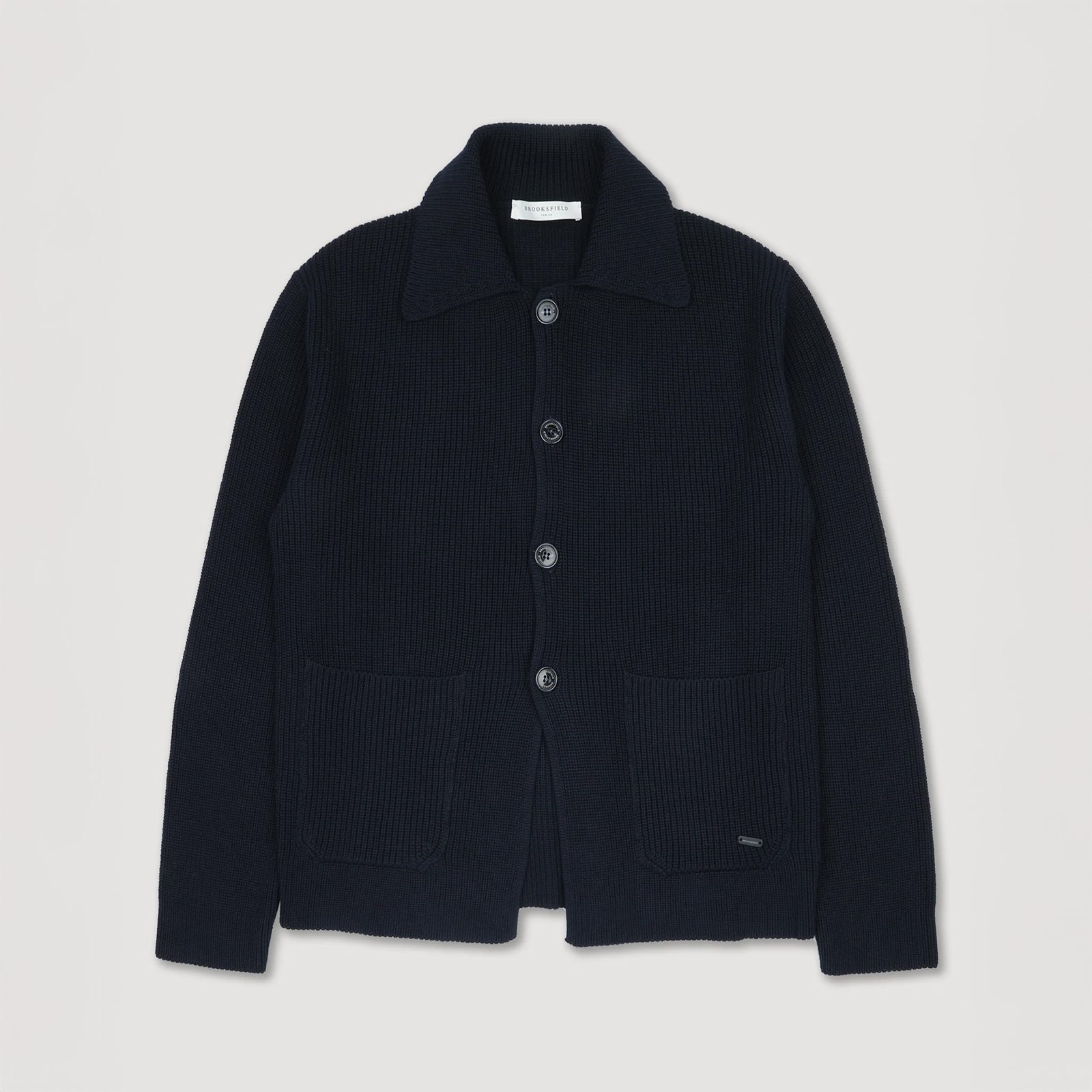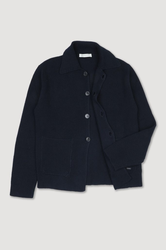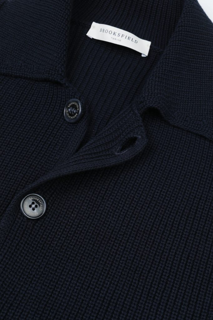 Pletený blazer od italské značky Brooksfield, vyrobený z organické bavlny technikou anglického polopatentu. Výsledkem je tak pletenina s výraznou strukturou a solidní gramáží, která drží tvar jako sako, ale nosí se s volností svetru (a díky knoflíkům připomíná cardigan!). K tomu rovný střih, široký košilový límec, zapínání na čtveřici knoflíků, které končí štědře nad spodním lemem, a dvě nakládané kapsy vpředu. Takové tři v jednom.