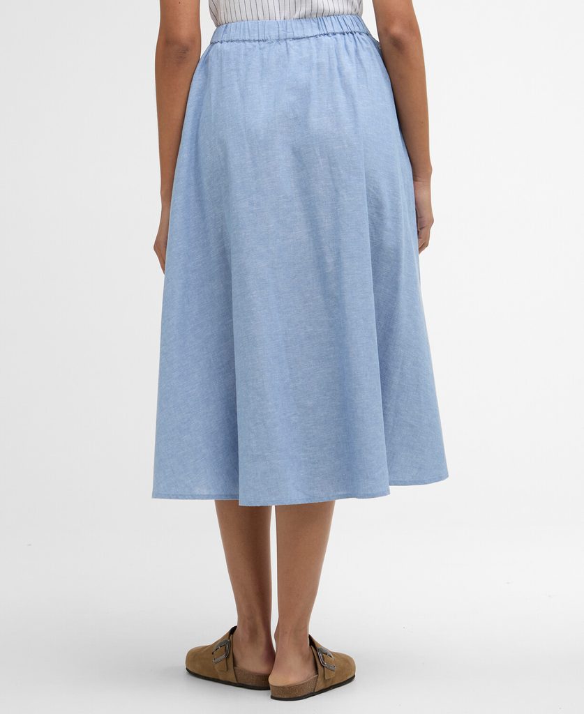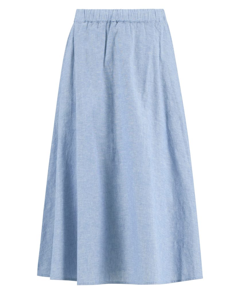 Midi sukně ze směsi bavlny a lnu v šambré/chambray vazbě, tedy lehké tkaniny, která na první pohled připomíná džínovinu, ale je výrazně tenčí a vzdušnější. Sukně má pružný pas s jemným řasením, z nějž přechází do volnější áčkové siluety. Po stranách má decentně skryté kapsy, které se ale jistě budou každé místní dámě hodit.