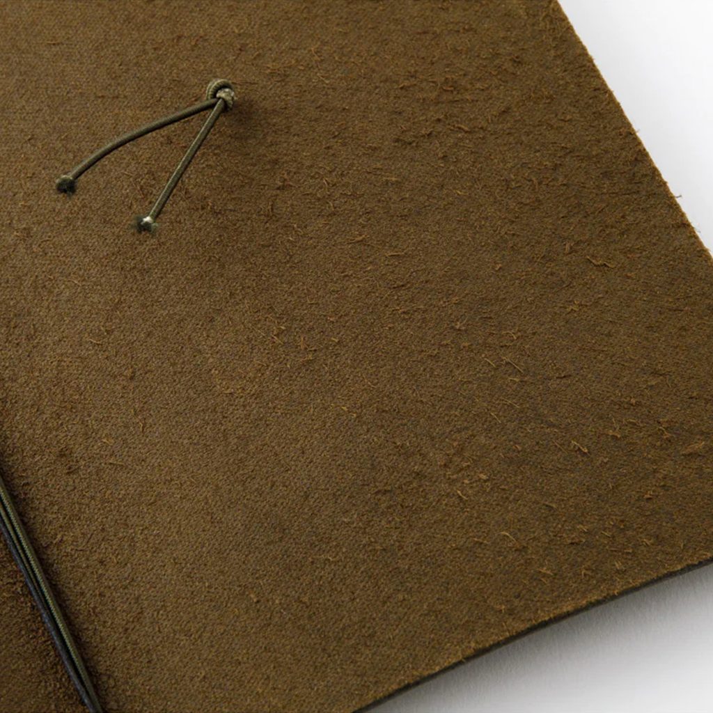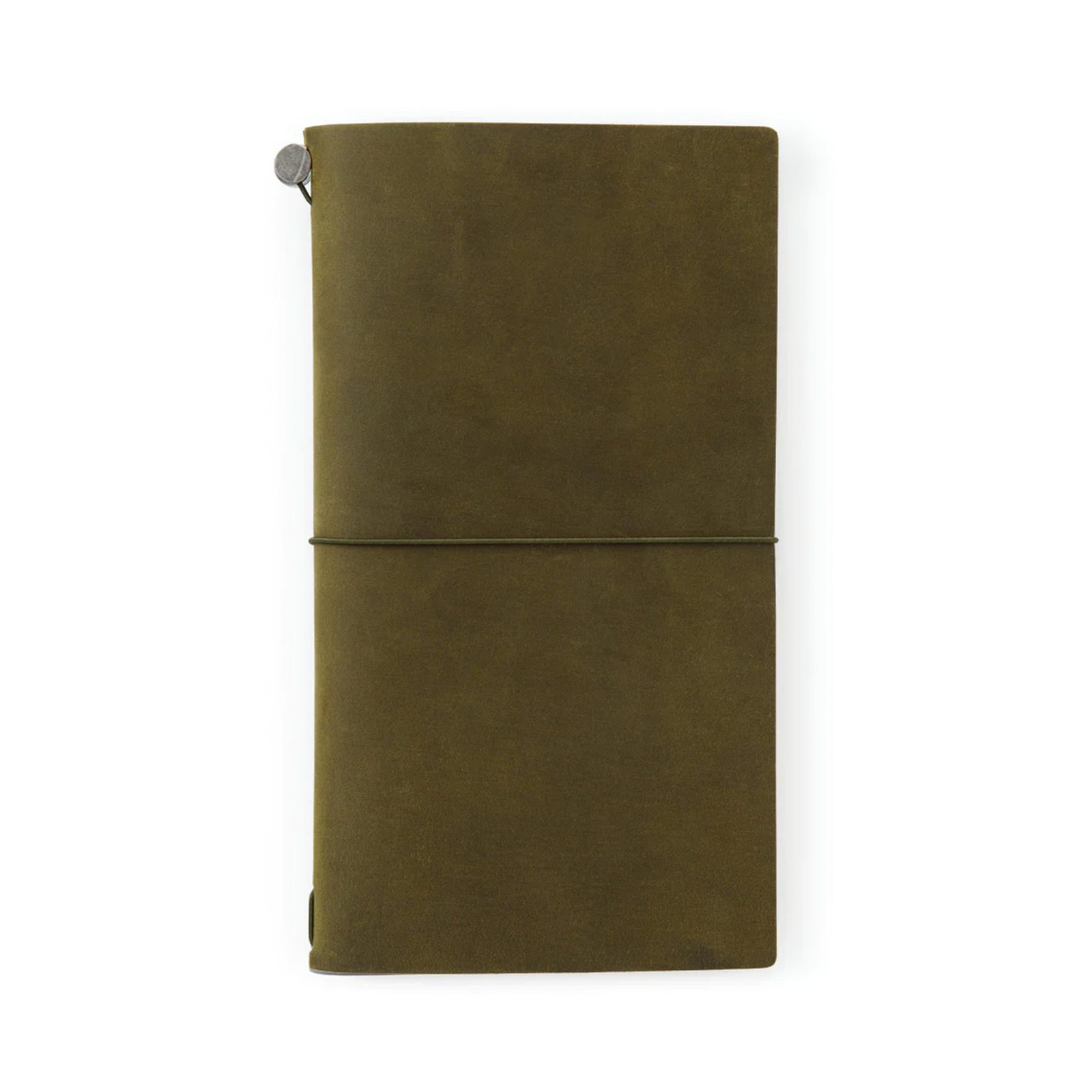 Cestovatelský zápisník Traveler's Company klasické velikosti s koženými deskami v olivové barvě.