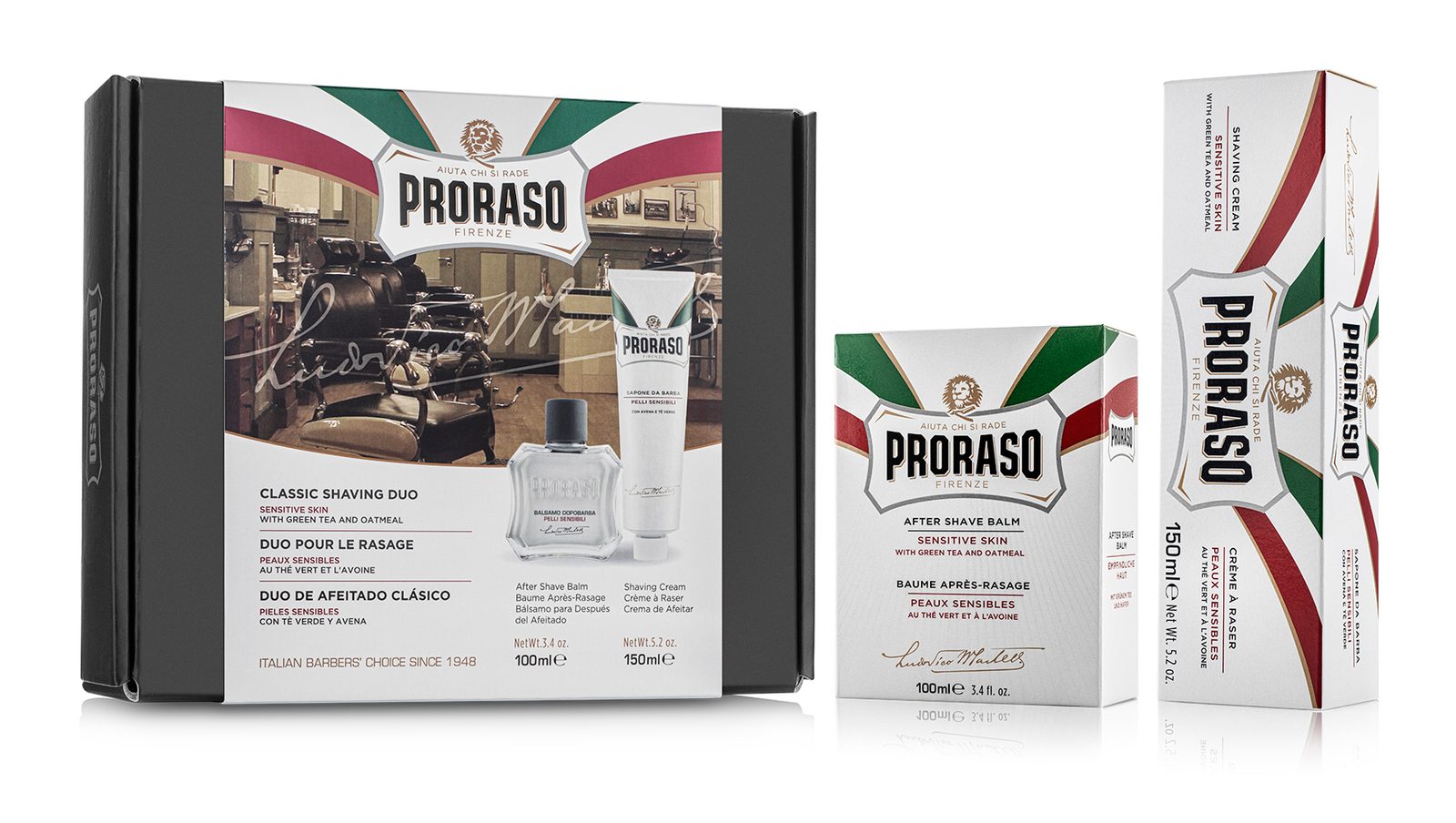 Proraso je synonymem mokrého holení. A taky nejstarší, nejznámější a téměř jistě i nejoblíbenější italský výrobce pánské kosmetiky - již od roku 1948. Ikonická je hlavně jejich univerzální zelená (eukalyptová) řada. Bílá řada obsahuje aloe vera a je vhodná pro citlivou pokožku, červená řada se santalovým dřevem zase pro husté a silné vousy. Speciální řady s vůni dřeva a koření, cypřiše a vetiveru a středozemního citrusu si pak tito Italové připravili pro vousáče.