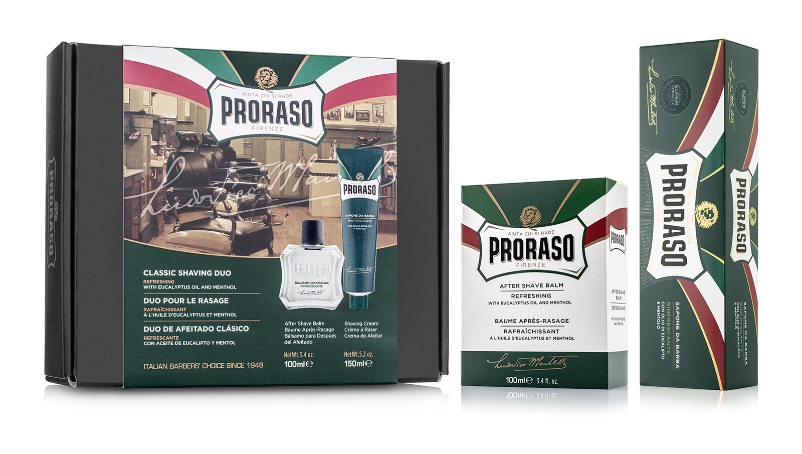Proraso je synonymem mokrého holení. A taky nejstarší, nejznámější a téměř jistě i nejoblíbenější italský výrobce pánské kosmetiky - již od roku 1948. Ikonická je hlavně jejich univerzální zelená (eukalyptová) řada. Bílá řada obsahuje aloe vera a je vhodná pro citlivou pokožku, červená řada se santalovým dřevem zase pro husté a silné vousy. Speciální řady s vůni dřeva a koření, cypřiše a vetiveru a středozemního citrusu si pak tito Italové připravili pro vousáče.