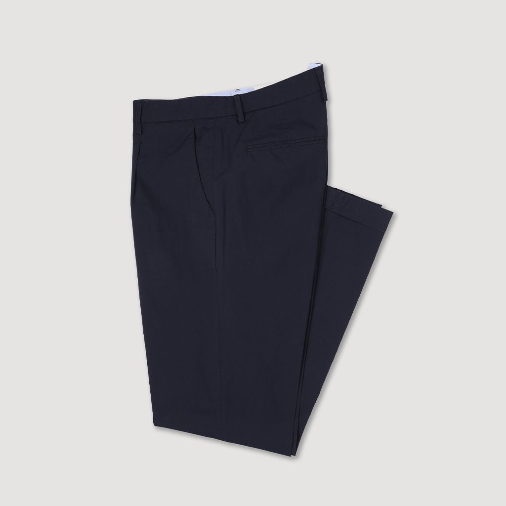 Pořádně old-money verze klasických chinos kalhot. Tyhle jsou obohaceny o sámky a francouzské zapínání, to dobré z klasiky však také zůstává: dvojice předních a dvojice zadních kapes, očka na pásek, příměs strečového elastanu pro celodenní pohodlí a především všeladící Navy barva.