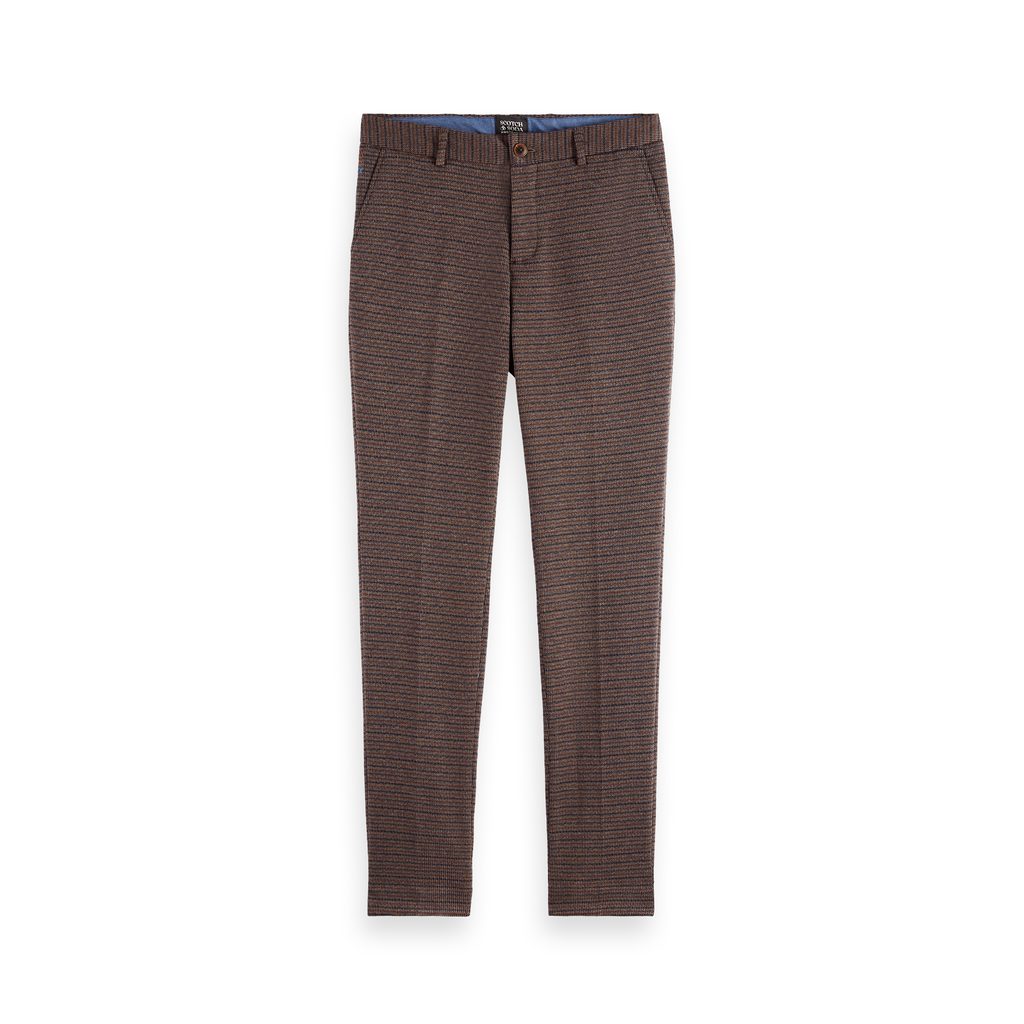 Tady žádný kepr nehledejte. Úpletové chinosky z Nizozemska jsou vyrobeny ze směsi materiálů v čele s polyesterem a nylonem, které jim propůjčují neobvyklou jemnost a poddajnost. Díky tomu si návrháři mohli dovolit všechny rozměry trochu utáhnout; kalhoty skvěle přiléhají a lichotí leckteré postavě.