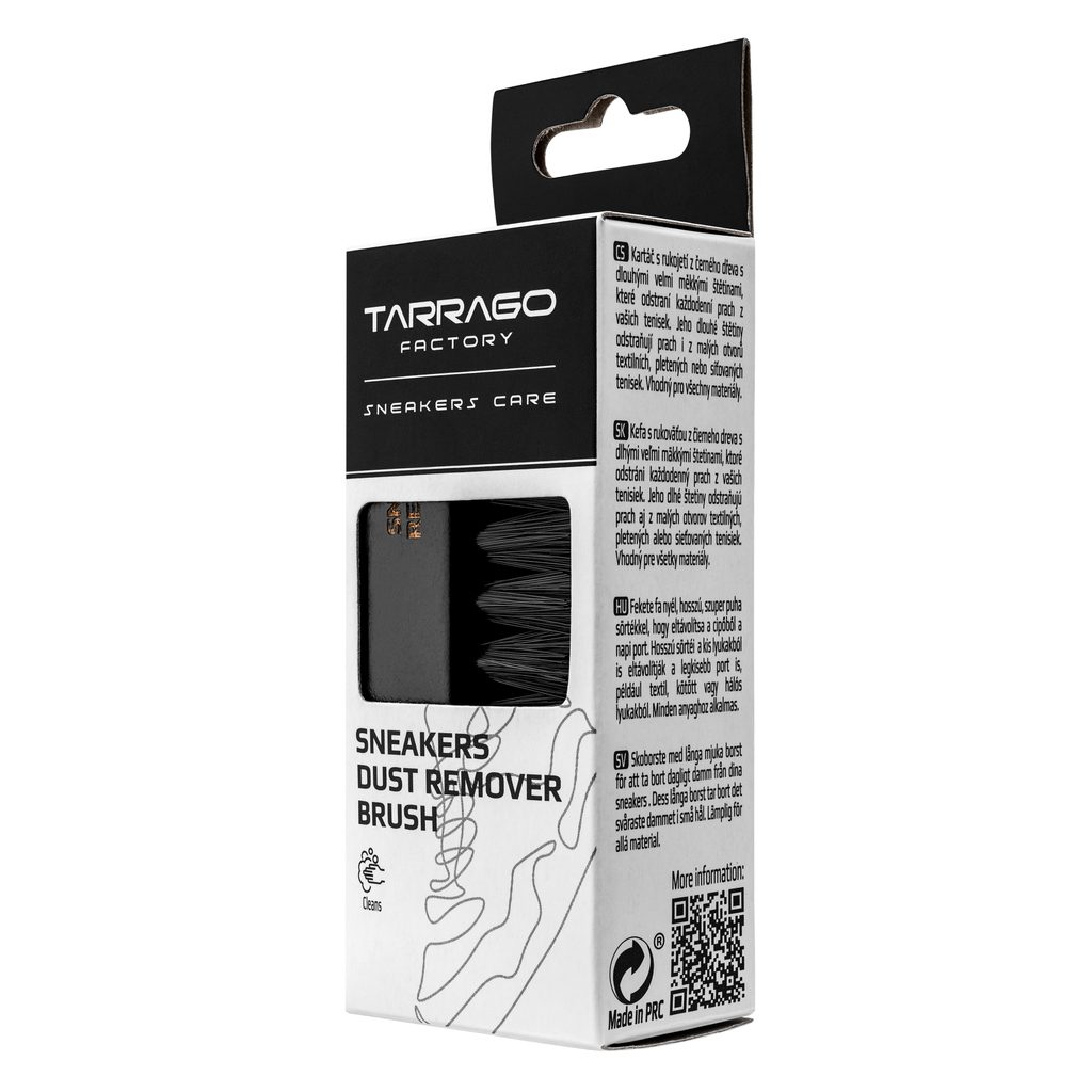 Kartáč na denní suché čištění tenisek. Má dlouhé a velmi měkké syntetické štětiny, které se tak snadno dostanou do drobných ok všech druhů pleteniny, síťoviny nebo jinak strukturovaného textilu, odkud klasický kartáček prach nevytáhne.