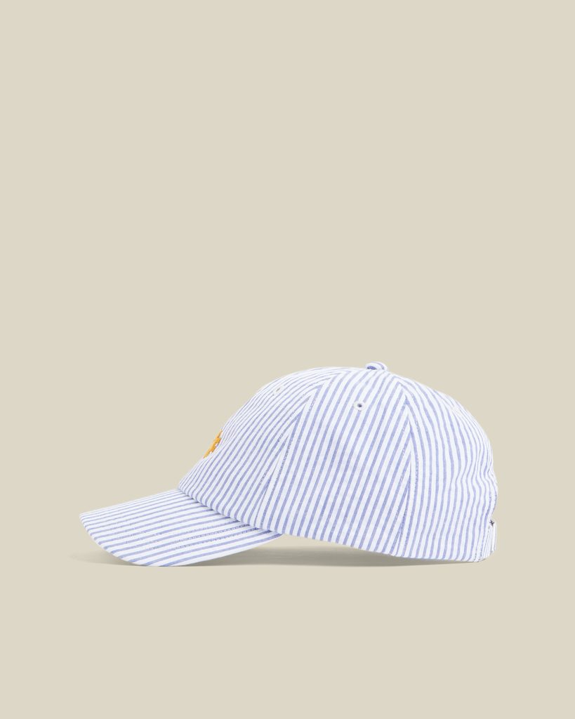 Letní kšiltovka od portugalské rodinné firmy Portuguese Flannel z bavlněného seersuckeru – látky s charakteristickým zvlněným povrchem, kde se hladké a svraštělé proužky střídají, a nechávají tak mezi látkou a pokožkou vzduch. Pravda je, že na kšiltovce je to spíš dekorativní, najdete tu přesto charakteristické proužky. A květinku!