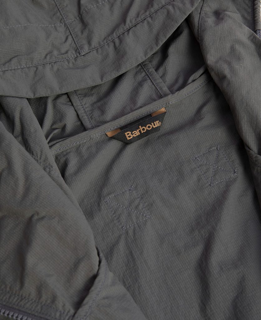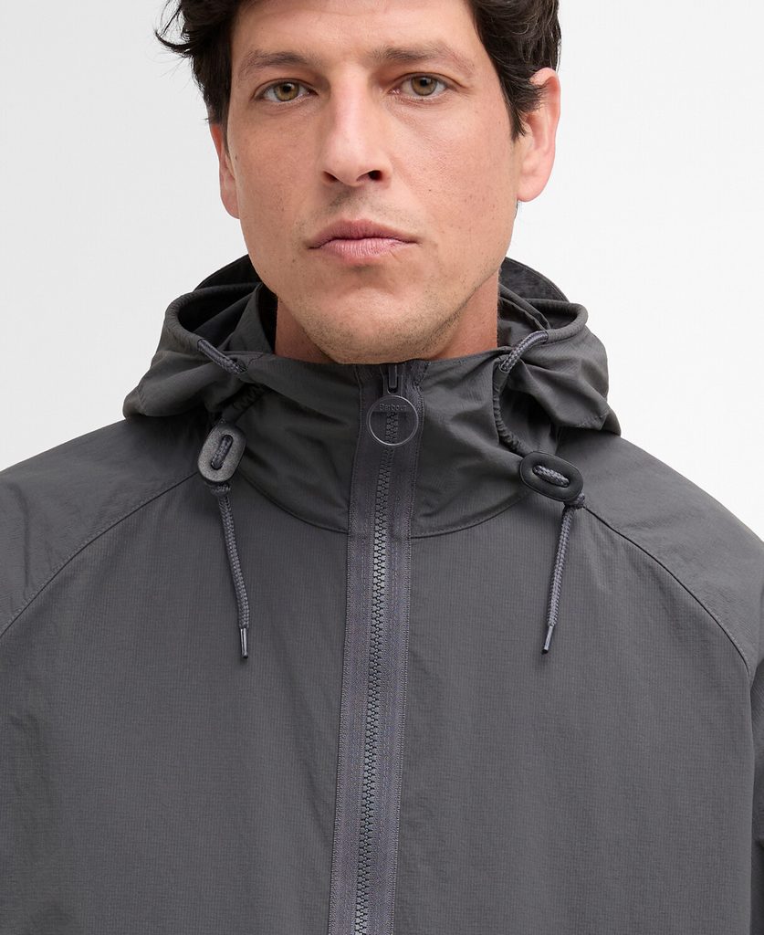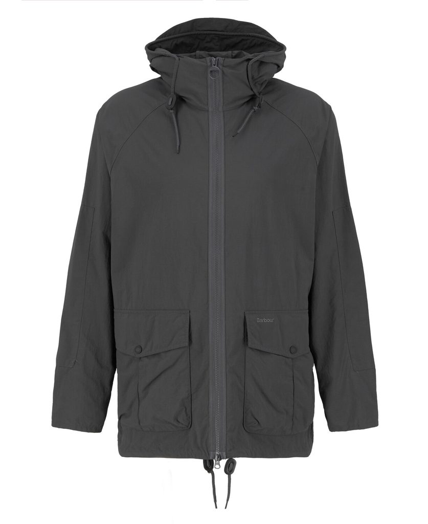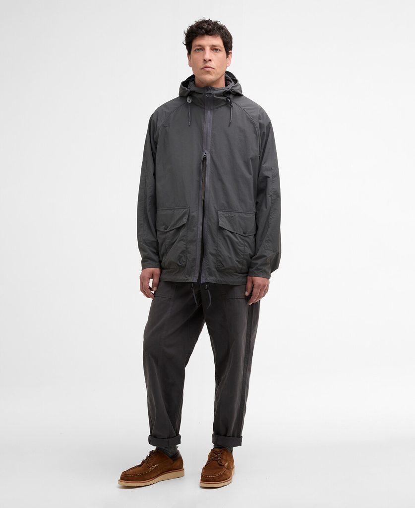 Barbour Re-Engineered je řada, která bere ikonické modely z archivů značky a dává jim modernější háv. Wading Casual Jacket vychází z principů rybářské bundy – odtud volný střih, kapuce se stahovací šňůrkou a D-kroužek na spodním lemu. Materiál je lehký suchý polyamid bez podšívky, takže bunda prakticky nic neváží. Vpředu otevřený zip bez krycí légy, dole dvě nakládané kapsy s klopou na patentku, na rukávech výztužné nášivky.