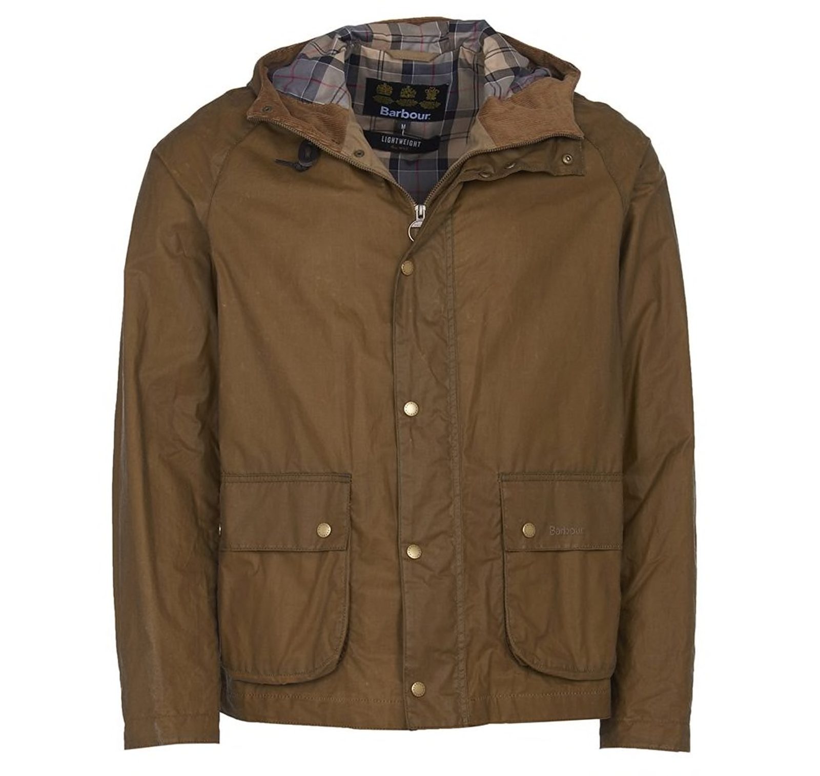 Krátká parka Barbour ušitá z voskované bavlny - ovšem nižší gramáže, díky čemuž je nejen voděodolná, ale i lehoučká a skladná. Na první pohled zaujme větší kapucí s tartanovo-manšestrovou podšívkou, dvěma velkými předními kapsami, zapínáním na patentky a zip a moderním vyštíhleným střihem.