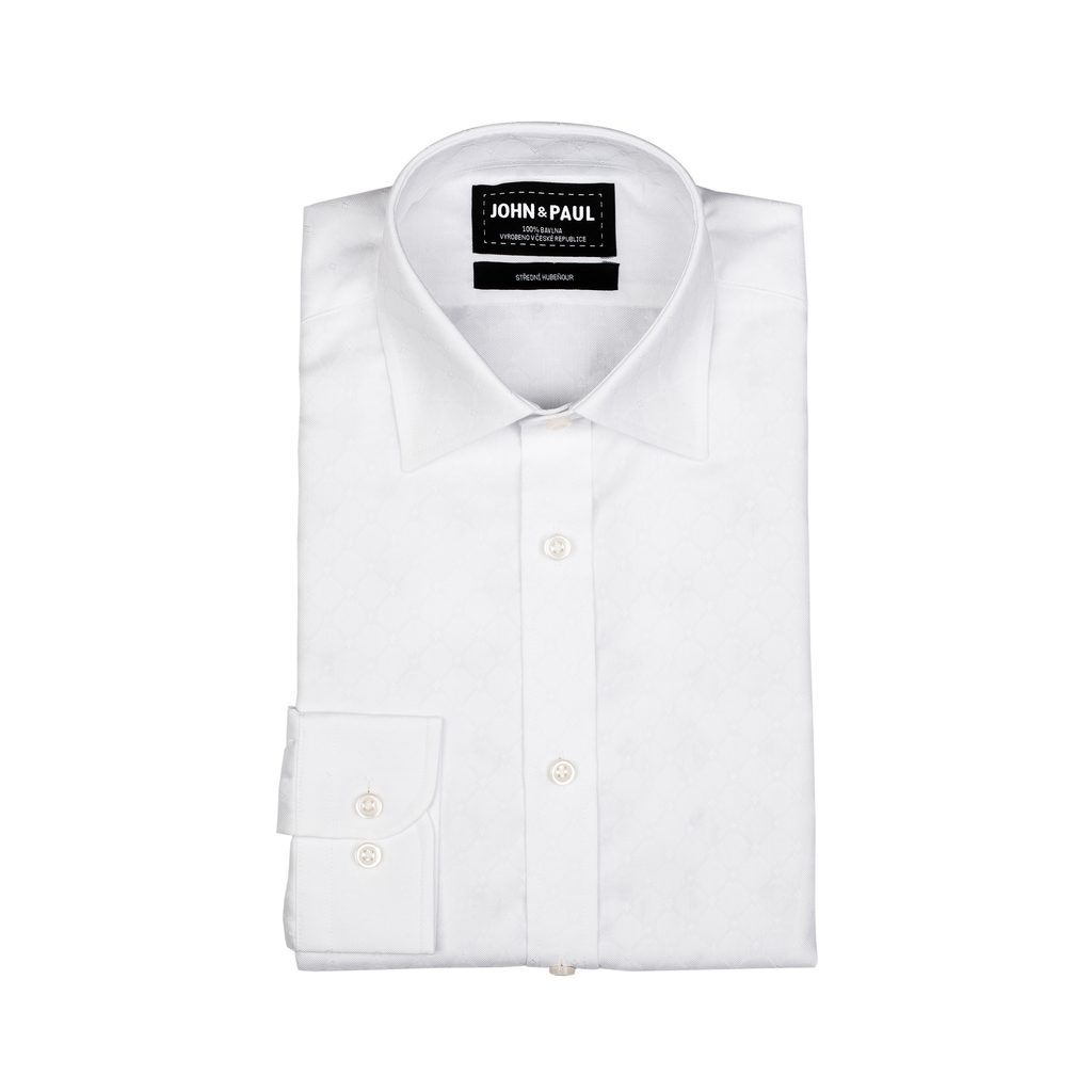 Bílá košile s jemným diagonálním vzorem ušitá z příjemné bavlny. Klasický límec, manžety na běžné knoflíky, výroba v ČR. Jeden z 18 limitovaných modelů naší podzimní kolekce.