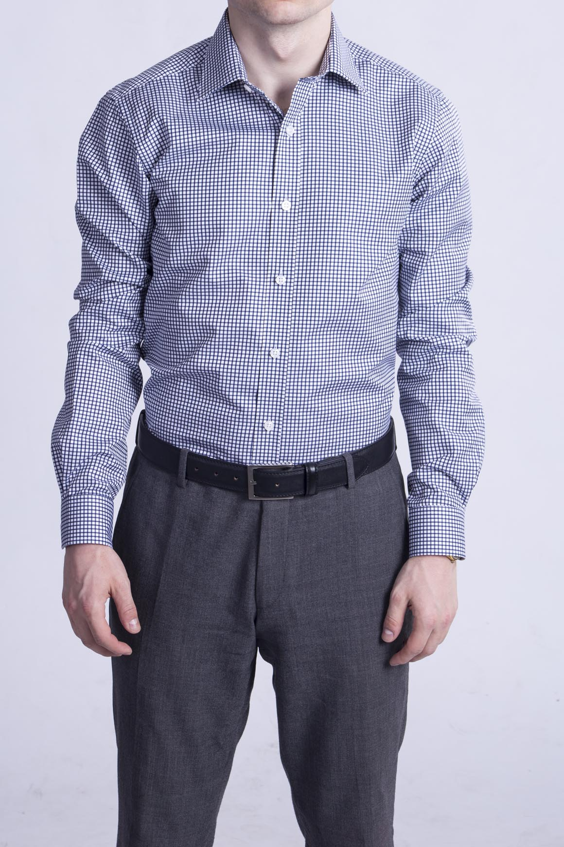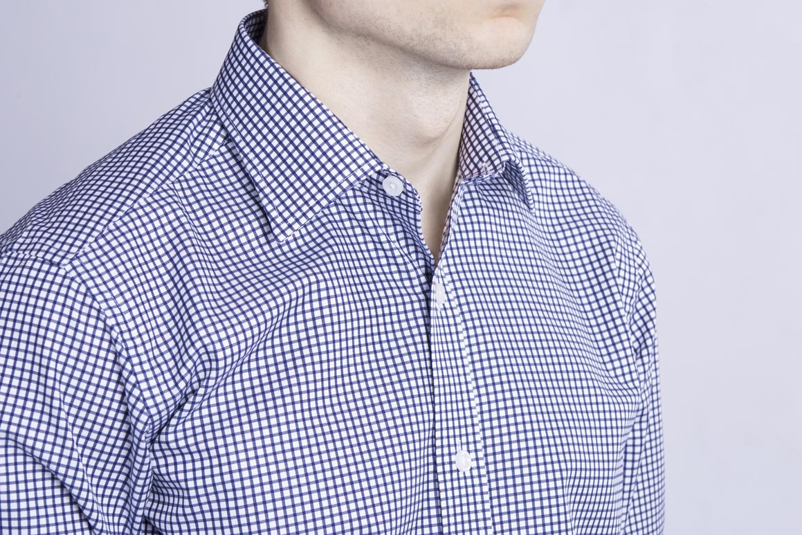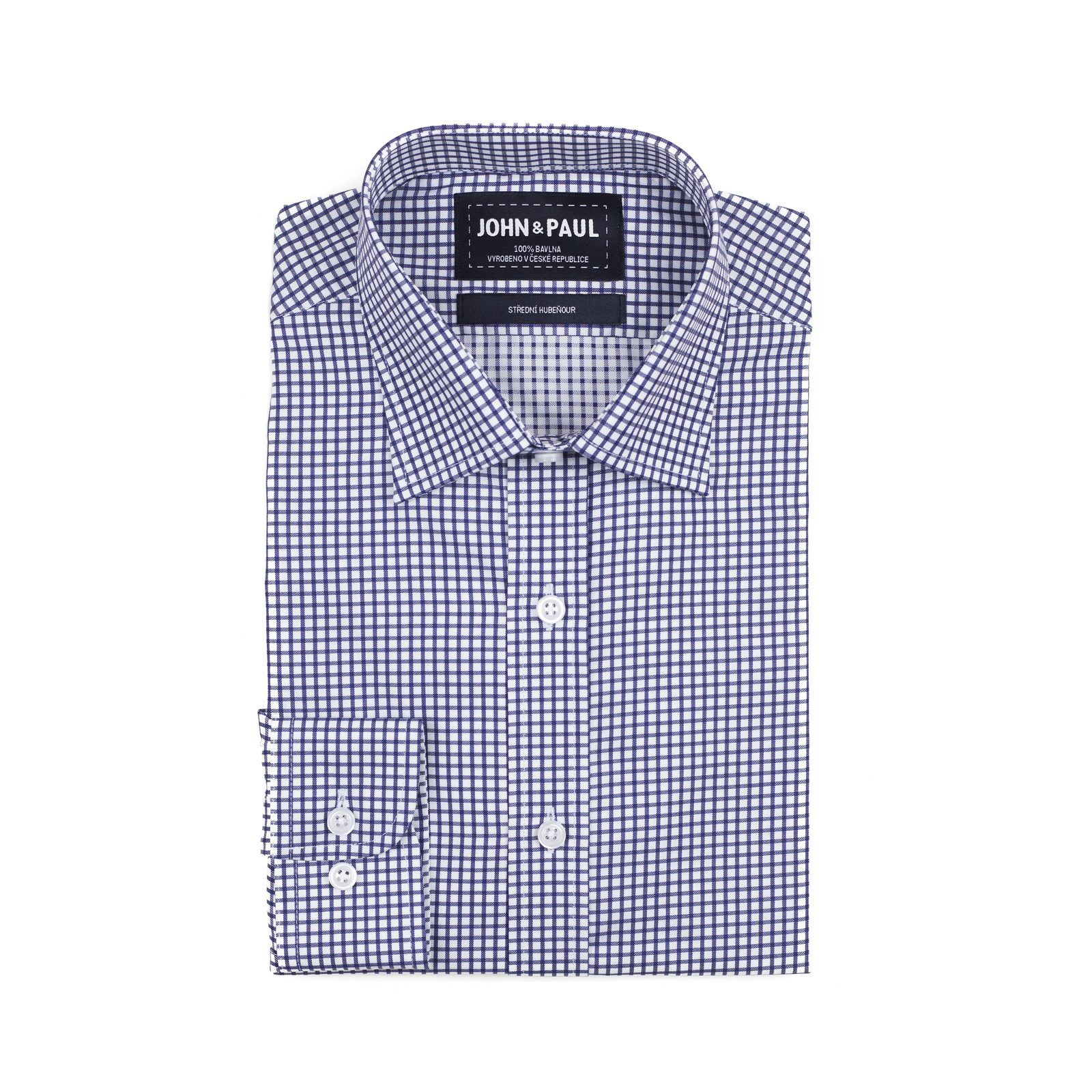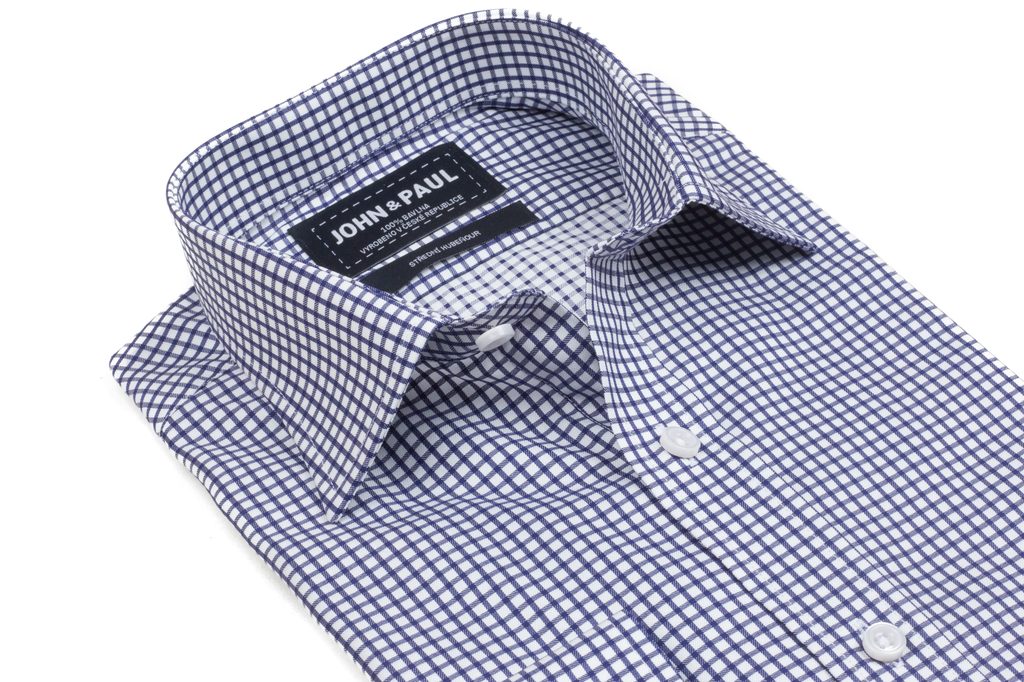 Bílá košile s tmavě modrou mřížkou. 100% bavlna, manžety na knoflíky a klasický límec.