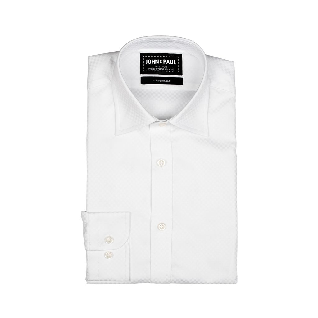 Bílá košile s drobným kostičkovaným vzorkem ušitá v ČR ze 100% dvojmoskanné bavlny. Klasický límec, manžety na běžné knoflíky. Součást naší podzimní kolekce.