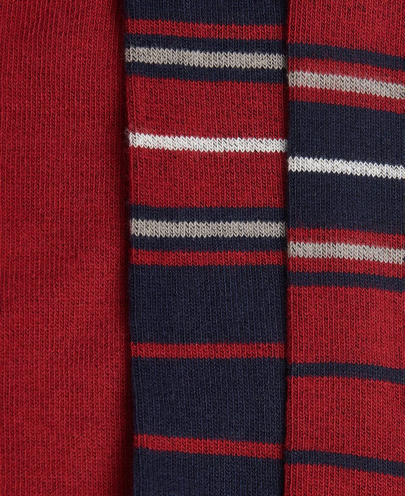 Minimalisticky bíle zabalená dárková sada tří párů ponožek: dvou vzorovaných, jednoho plnobarevného. Vzor připomíná minimalistický tartan, a ačkoli jsou dva ze tří párů laděny do červena, rozhodně je nemusíte nosit pouze na Vánoce.