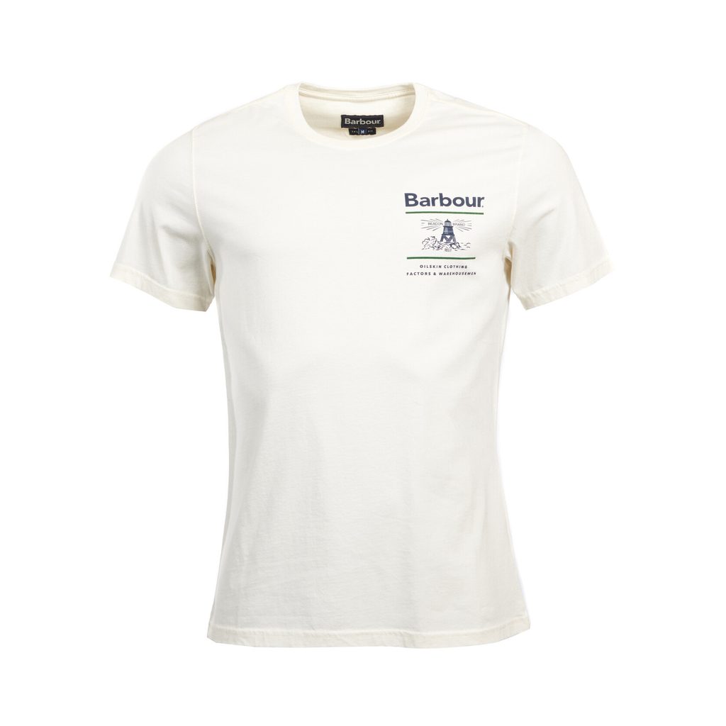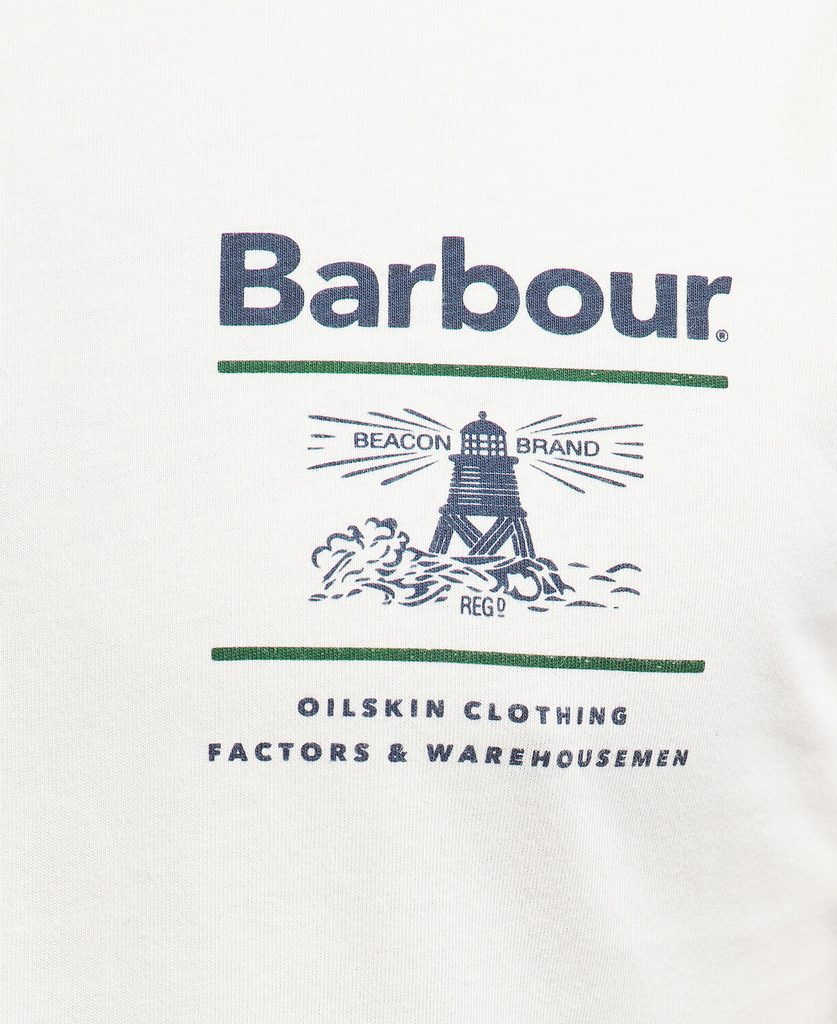 Bílé tričko z bavlny s kontrastním tmavým potiskem majáku na levé straně. Součást limitované sezonní kolekce od ostrovní legendy Barbour.
