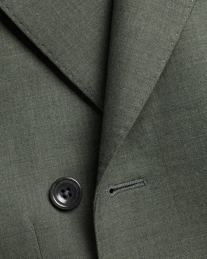 Toto překrásné dvouřadé sako je lehce vyštíhleného střihu (Slim fit, padne většině postav), konstrukce s polotuhou vložkou v přední části zajišťuje tvar a zároveň přirozenou splývavost. Vlna má přirozený stretch a dobře se zotavuje z pomačkání. Na detailech je vidět péče o celek: prošití AMF podél klopy, límce a kapsových chlopní, dva krát čtyři funkční manžetové knoflíky z tzv. rostlinné slonoviny (ořechu tagua), průhmatové kapsy a výrazná podšívka s čejkami, což je tradiční motiv této značky.