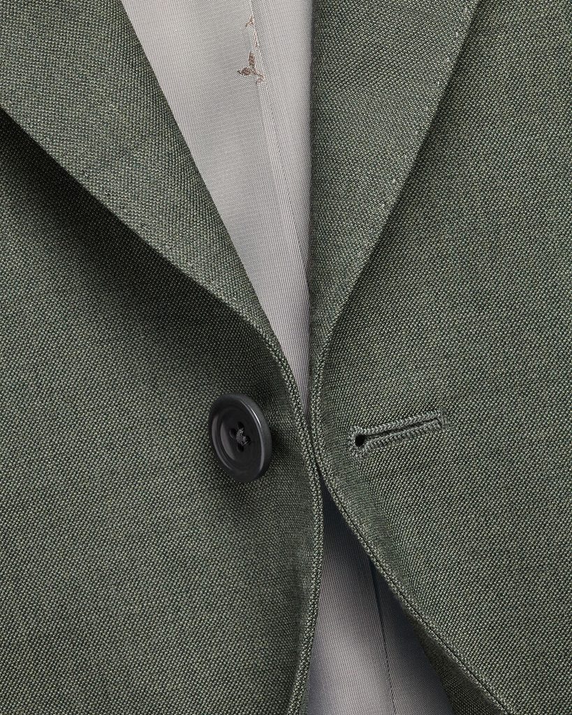 Sako je lehce vyštíhleného střihu, konstrukce s polotuhou vložkou v přední části zajišťuje tvar a zároveň přirozenou splývavost. Vlna má přirozený stretch a dobře se zotavuje z pomačkání. Na detailech je vidět péče o celek: prošití AMF podél klopy, límce a kapsových chlopní, dva krát čtyři funkční manžetové knoflíky z tzv. rostlinné slonoviny (ořechu tagua), průhmatové kapsy a výrazná podšívka s čejkami, což je tradiční motiv této značky.