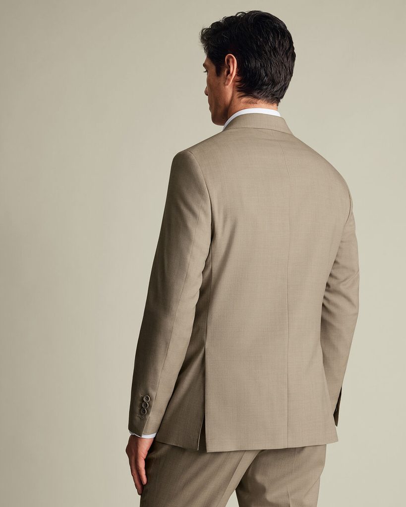 Slovo Sharkskin, jež najdete v názvu tohoto obleku, odkazuje na specifický způsob tkaní: do kepru se střídavě proplétají dva odstíny příze (světlejší a tmavší), které tvoří jemný diagonální vzor. Výsledkem je látka s lehkým, tlumeným leskem, který se mírně mění podle úhlu světla – odtud název podle žraločí kůže, která se ve vodě podobně třpytí.