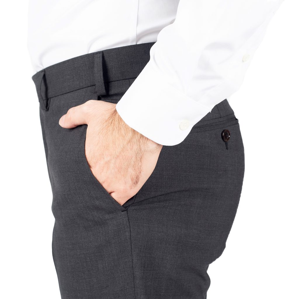 Šedé oblekové kalhoty John & Paul, konkrétně druhá verze, kde prošel úpravou střih. Ušili jsme jej z čisté španělské vlny Paulo de Oliveira kvality Super 110's v přirozeně elastické a nemačkavé cestovní úpravě, kterou doplňuje stylová kontrastní podšívka ze 100% viskózy.