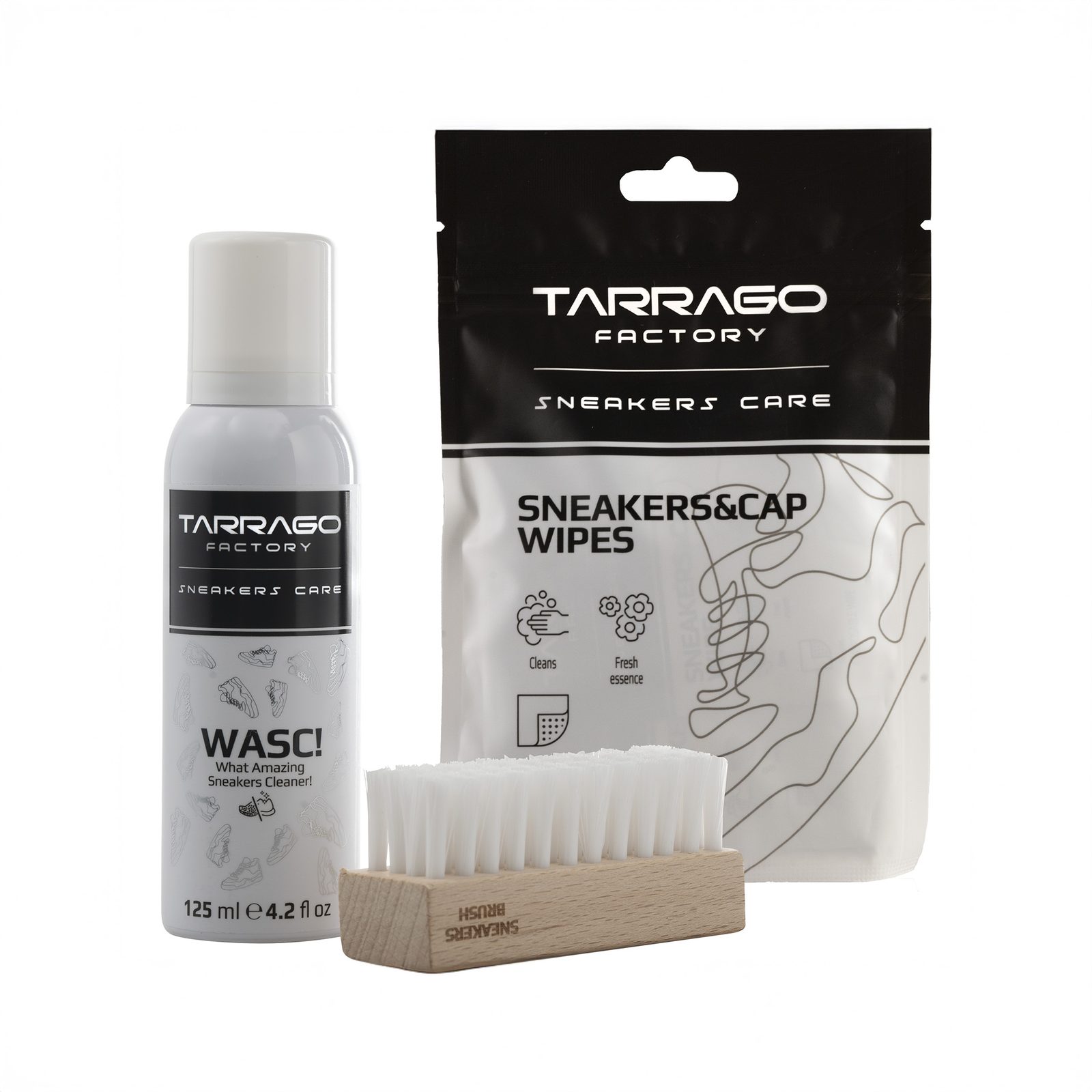Poněkud cestovnější a skladnější sada na čištění tenisek. Najdete v ní osvědčený silný čistič WASC!, který si poradí s odolnějšími skvrnami a oživí i mezipodešve, pětici jednotlivě balených ubrousků pro rychlou očistu i mimo domov. Doplněno o univerzální kartáč vhodný pro všechny typy materiálů včetně kůže a semiše.