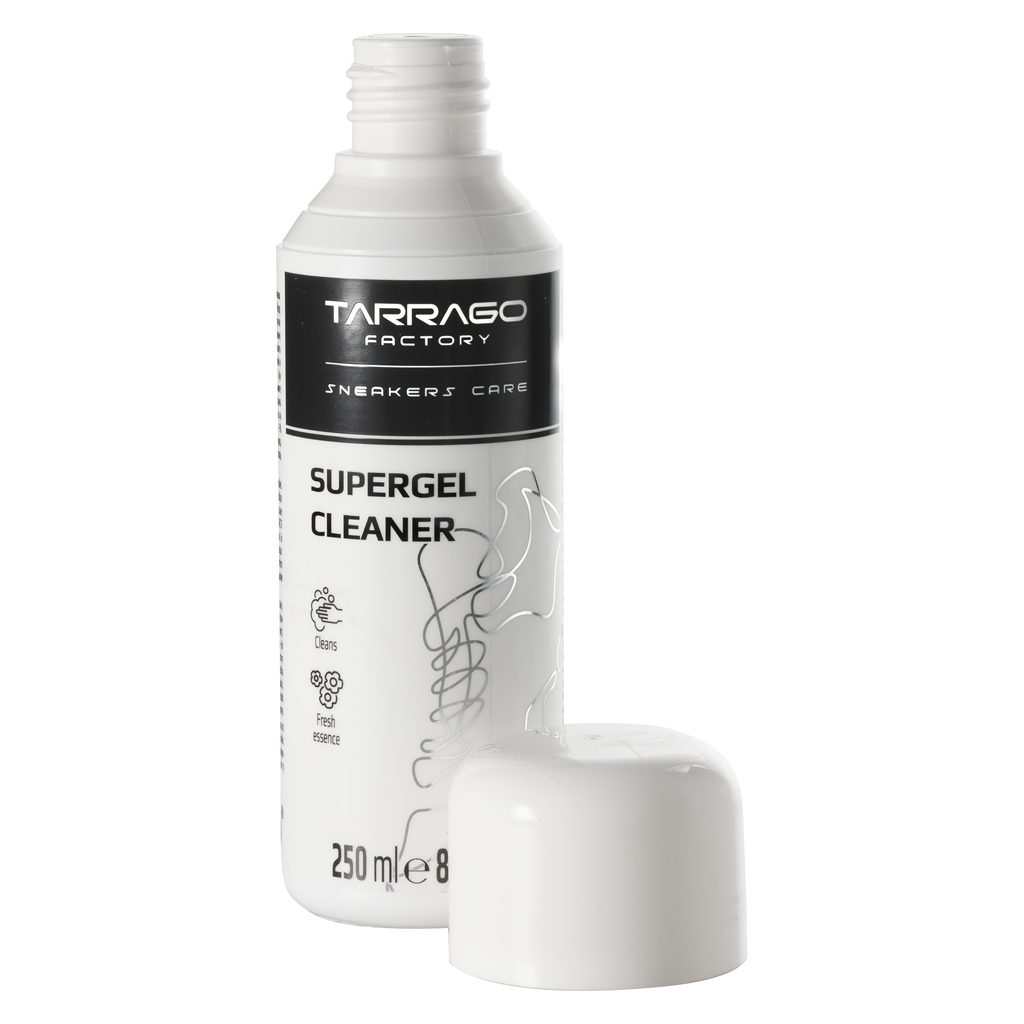 Supergel Cleaner hravě sundá špínu z textilních povrchů jak ručně, tak v pračce, což je u tenisek docela kumšt. Běžné prací prostředky totiž často rozpouštějí lepidlo, které drží podrážku k tělu boty. To Supergel nedělá; obsahuje složku, která lepidlo chrání, takže boty z pračky vyjdou, jak vešly.