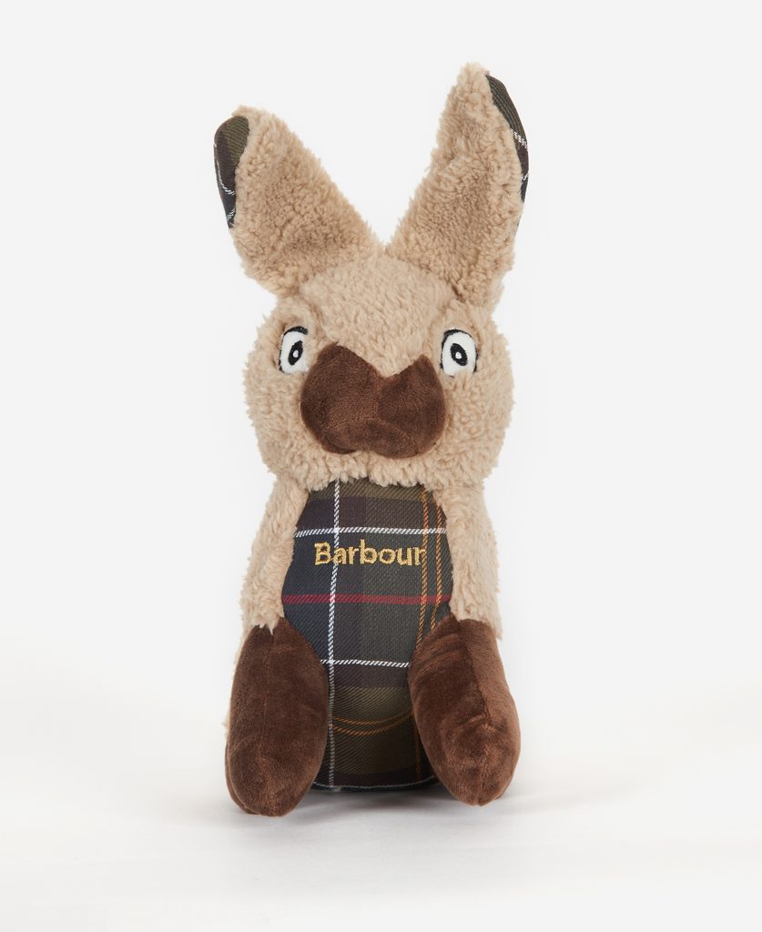 Pískací hračka ve tvaru králíka střídá tartanový vzor s fleecem. Ale pozor – je hlasitá!