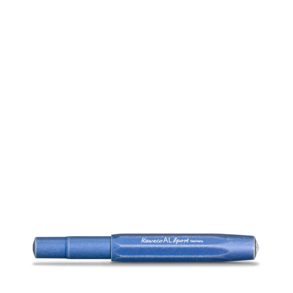Hliníkové plnicí pero z dílny proslulé německé firmy Kaweco. Skladné, bytelné, s lehkým tělem typického osmihranného tvaru. V balení klasická modrá bombička a hrot velikosti F.