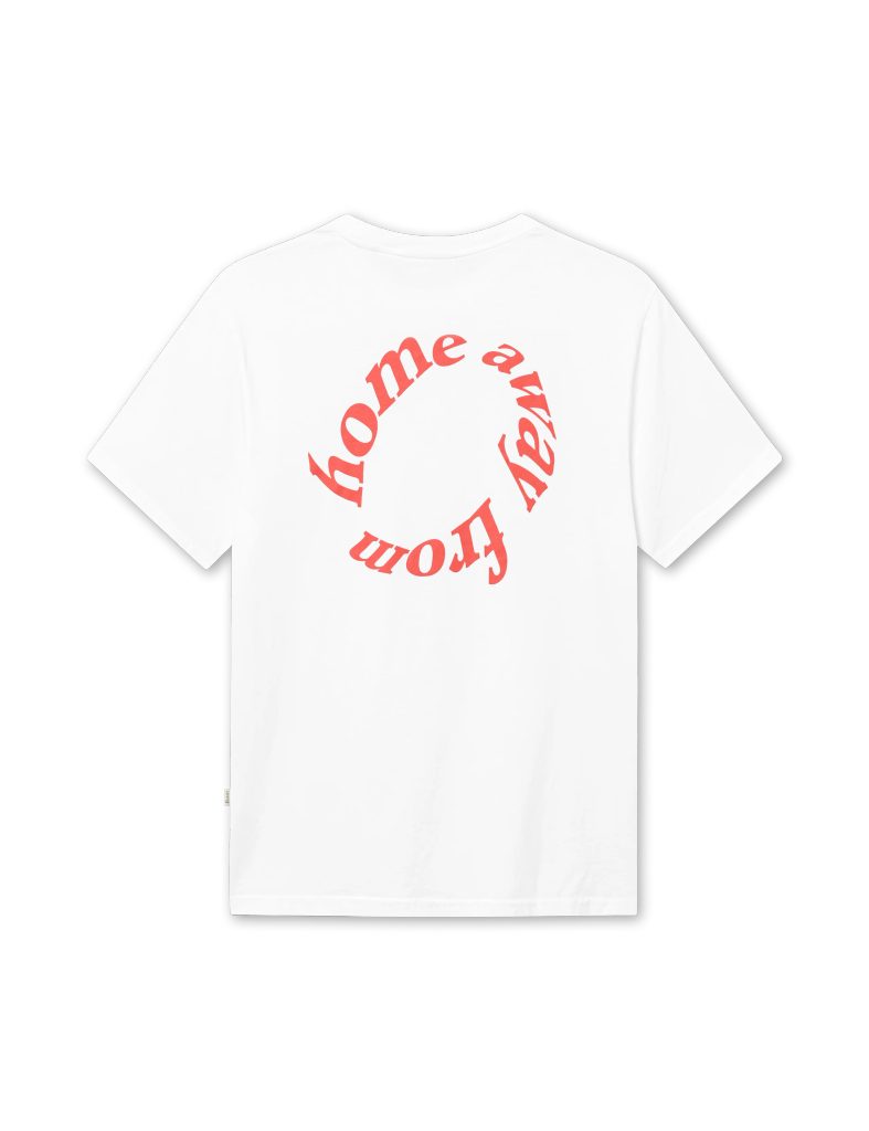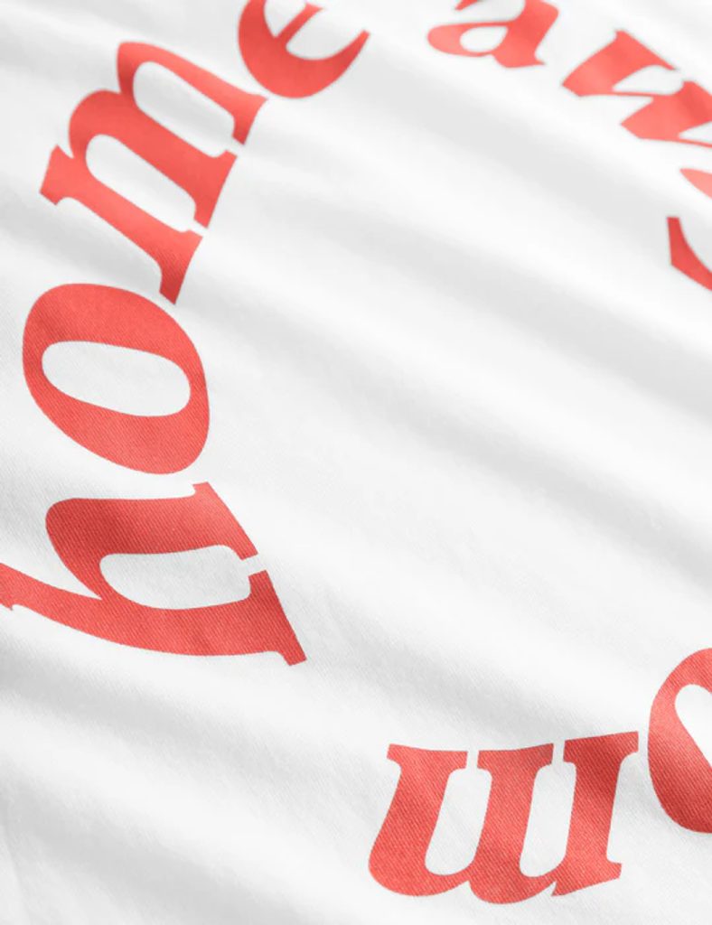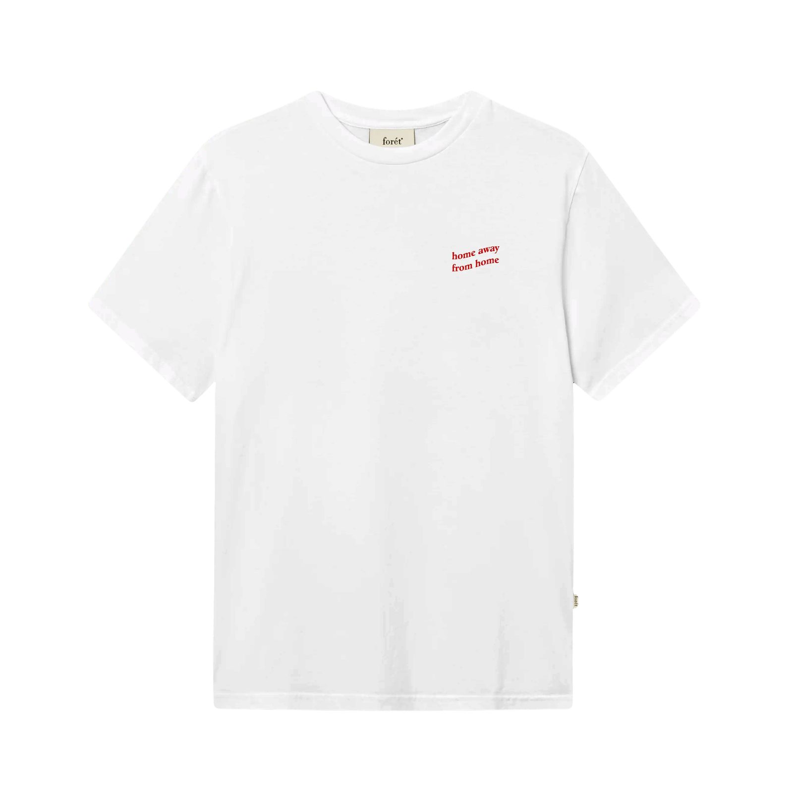 Domov daleko od domova. Rovnou dvakrát. Červeně vyvedený anglický text na jinak skvostně bílém tričku mírně vyšší gramáže skvěle doplňuje vrstvené outfity, díky velikosti potisku na zádech ale výborně funguje i samotné. A co víc? Inu, udržitelnost. Dánský design, evropská výroba, organická bavlna, neskutečná kvalita. A celodenní pohodlí ve volném střihu je u forétu stálý přívlastek.