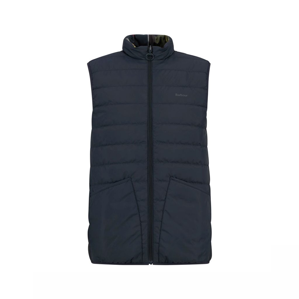 Oboustranná prošívaná vesta dvou tváří: jedna strana v klasickém Barbour tartanu, druhá decentní, tmavomodrá. Obě strany mají vlastní kapsy: tartanová strana zipové boční, jednobarevná nakládané ve stylu bundy Liddesdale. Výplň je syntetická, střih pravidelný, průramky lemované lycrou, takže vesta dobře sedí přes košili i přes svetr. Zapínání na zip s kroužkovým táhlem.