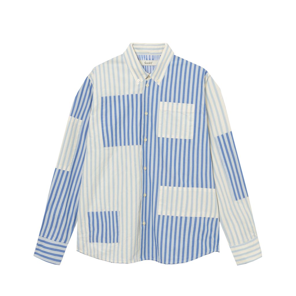 Dresscode na letní relax nelze podcenit. Naštěstí už nemusíte koukat jinam. Netradiční patchworková košile ve střídavě modré a bílé barvě z dánského studia forét je tím pravým ořechovým. A to včetně propínacího límce a dlouhých manžet na klasické knoflíky.