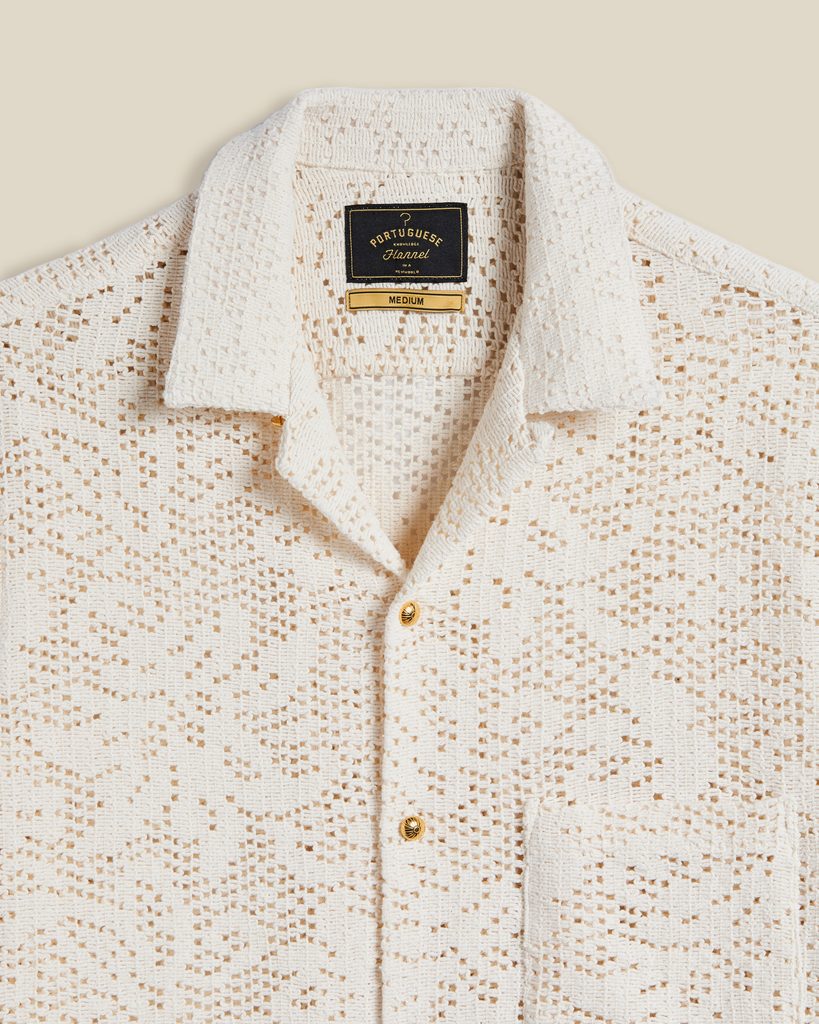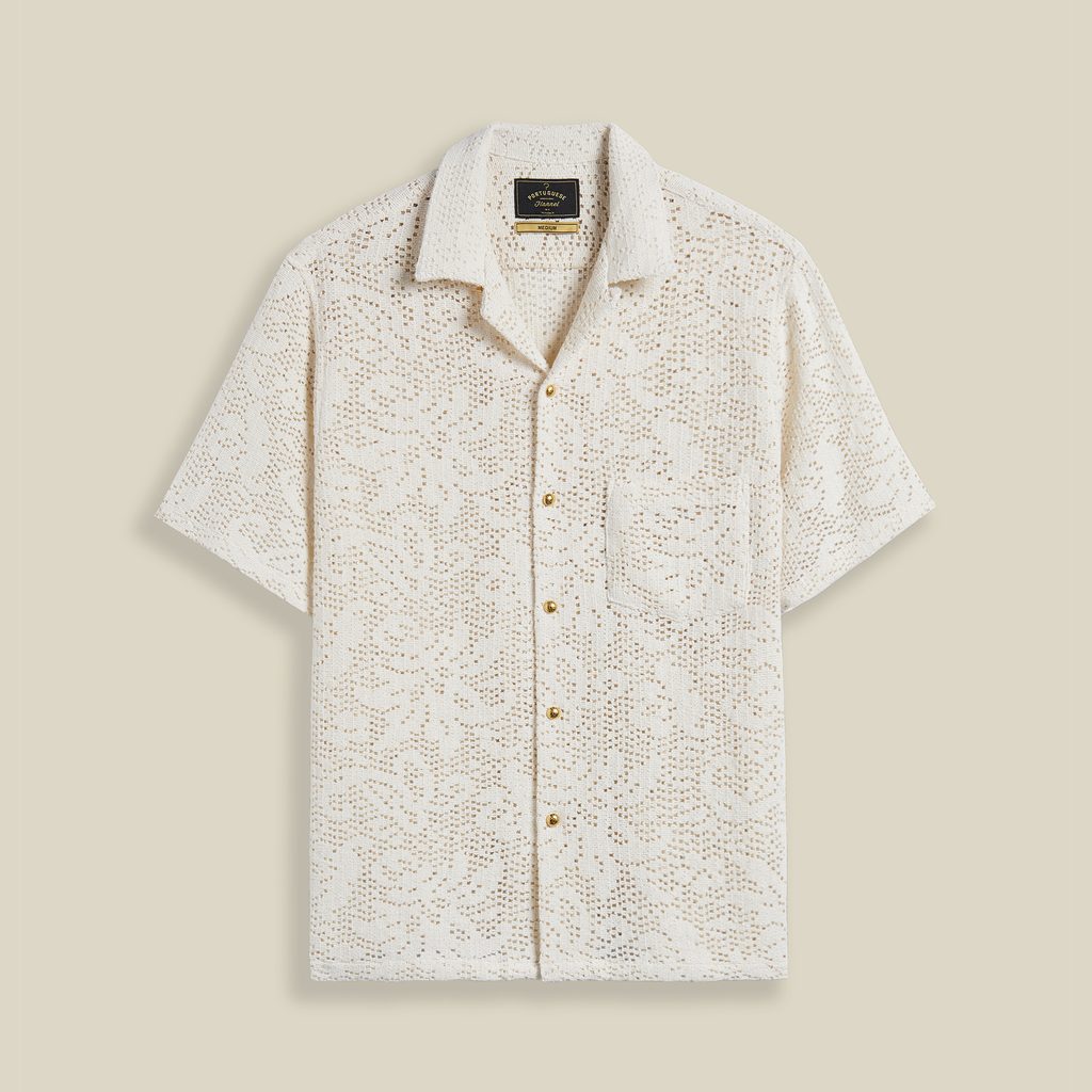 Průhlednému volnému úpletu, který se ve vzoru kroutí na této portugalské košili, se říká sheer. Nejčastěji sheerové oděvy najdete na módních přehlídkách, přesto už si svou cestu nalézají i k běžným smrtelníkům. Nejde o žádný nudismus, naopak – košile dá vkusně vyniknout všem Vašim tetováním či jiným okrasám.