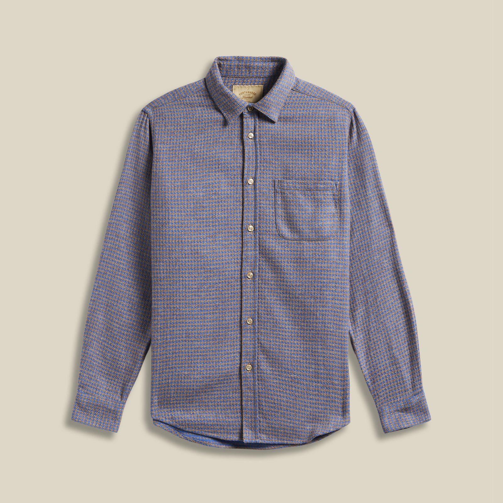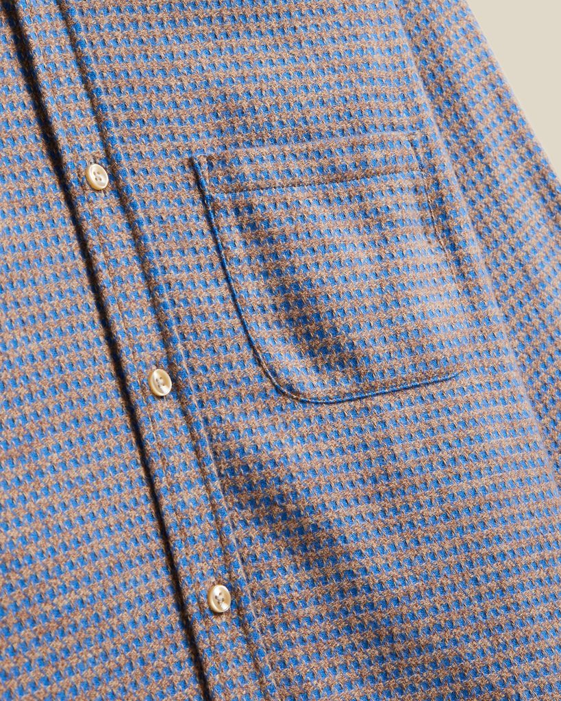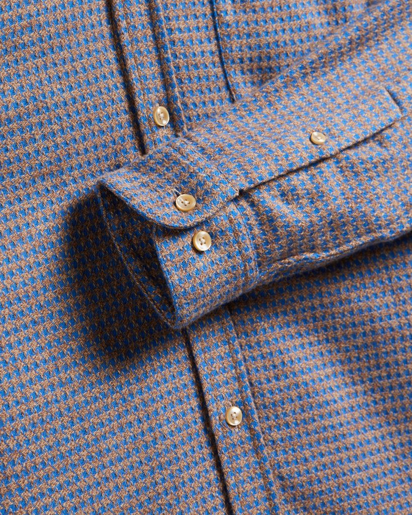 Pohodlná teplejší košile (jazykem lidu flanelka, i když není kostkovaná) z texturované bavlny vyšší gramáže, na níž v prvé řadě zaujme těsný vzor kohoutí stopy – v této barevné kombinaci střídá pronikavě modrou barvu zlatý kohout. Funkční manžety na dva knoflíky umožňují i povytažení rukávu, když zrovna vysvitne slunce.