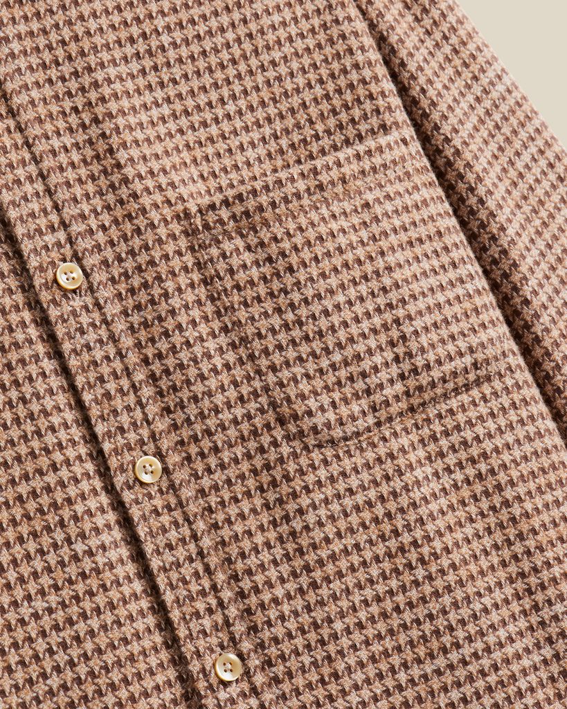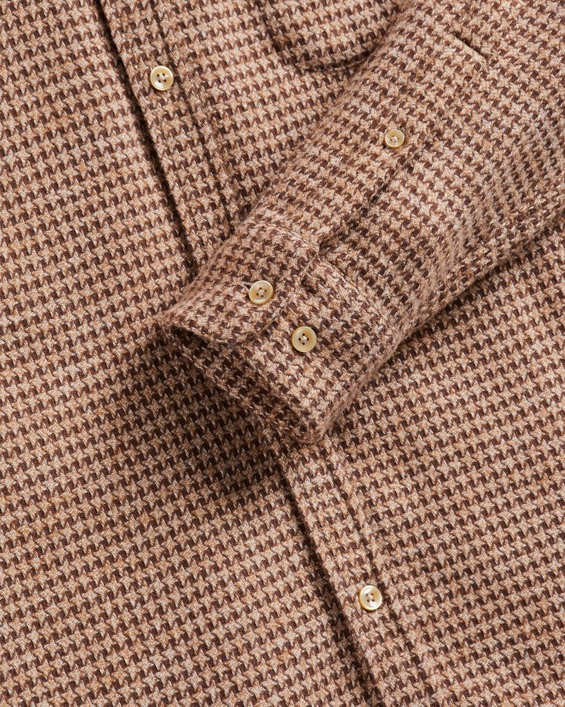 Pohodlná teplejší košile (jazykem lidu flanelka, i když není kostkovaná) z texturované bavlny vyšší gramáže, na níž v prvé řadě zaujme těsný vzor kohoutí stopy – v této barevné kombinaci střídá světle hnědou barvu výrazně tmavší kohout. Funkční manžety na dva knoflíky umožňují i povytažení rukávu, když zrovna vysvitne slunce.