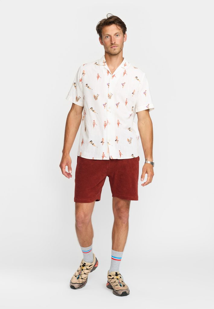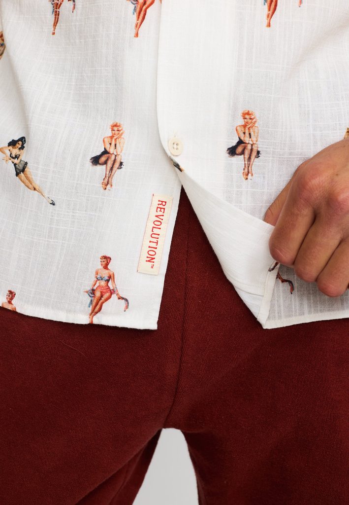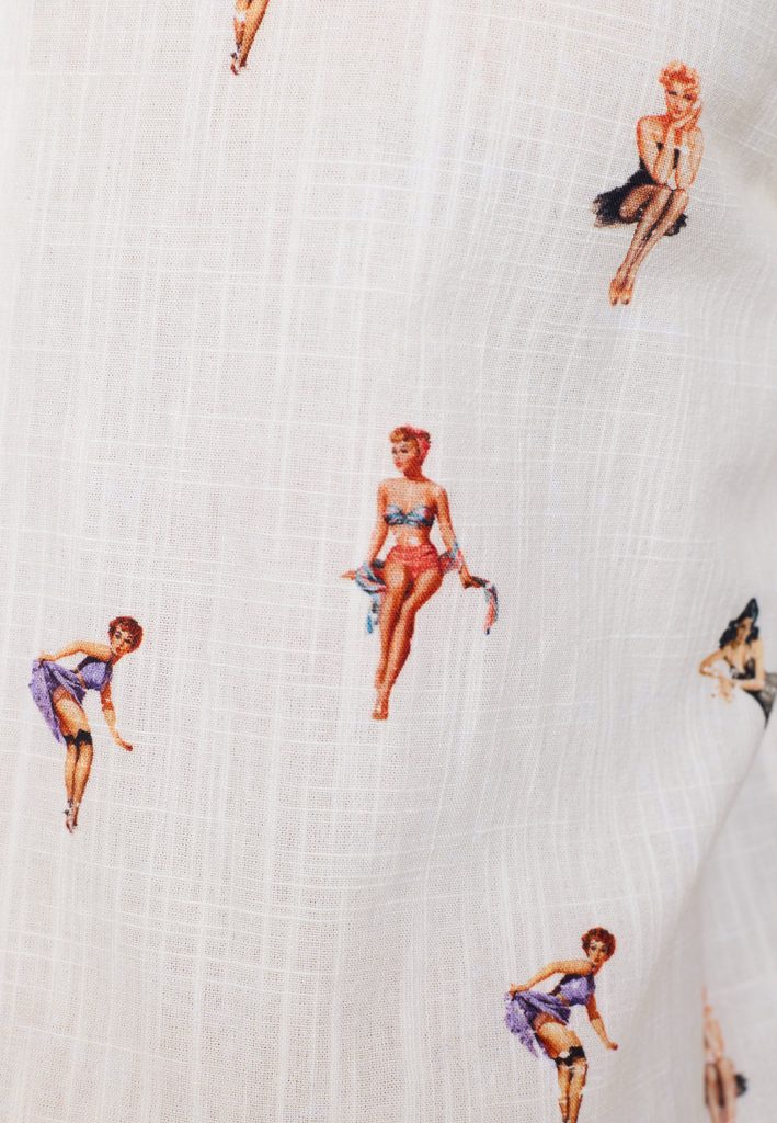 Košile s krátkým rukávem a kubánským límcem od Revolution. Od toho jsme se tu ale nesešli. To hlavní je, že po celé ploše košile najdete drobný potisk kabaretních dívek ve stylu ilustrací padesátých let. Noste zodpovědně, prodej není věkově omezen.