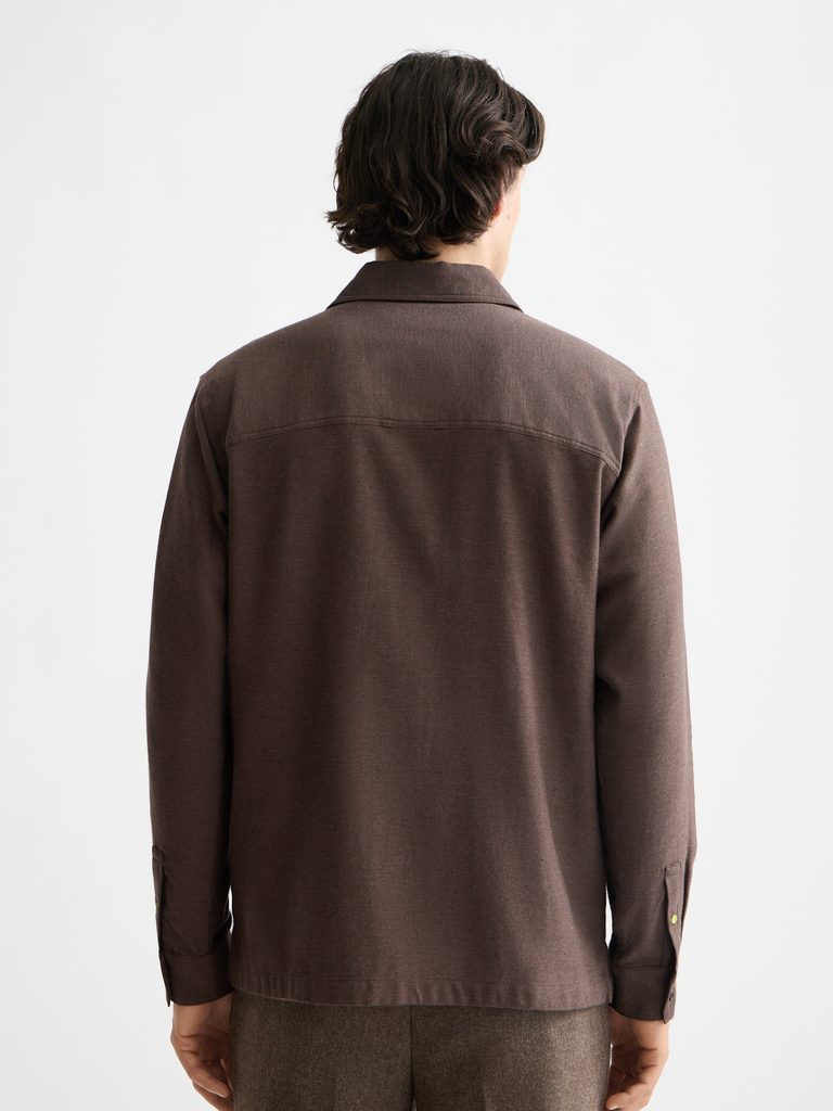 Tmavě hnědá košile, která díky pevnému materiálu a dvojici náprsních kapes působí skoro jako lehká bunda. Praktická, jednoduchá a dostatečně univerzální, aby sedla k džínám i k elegantnějším kalhotám. Ideální volba na dny, kdy chcete mít vrstvený outfit bez složitého přemýšlení.